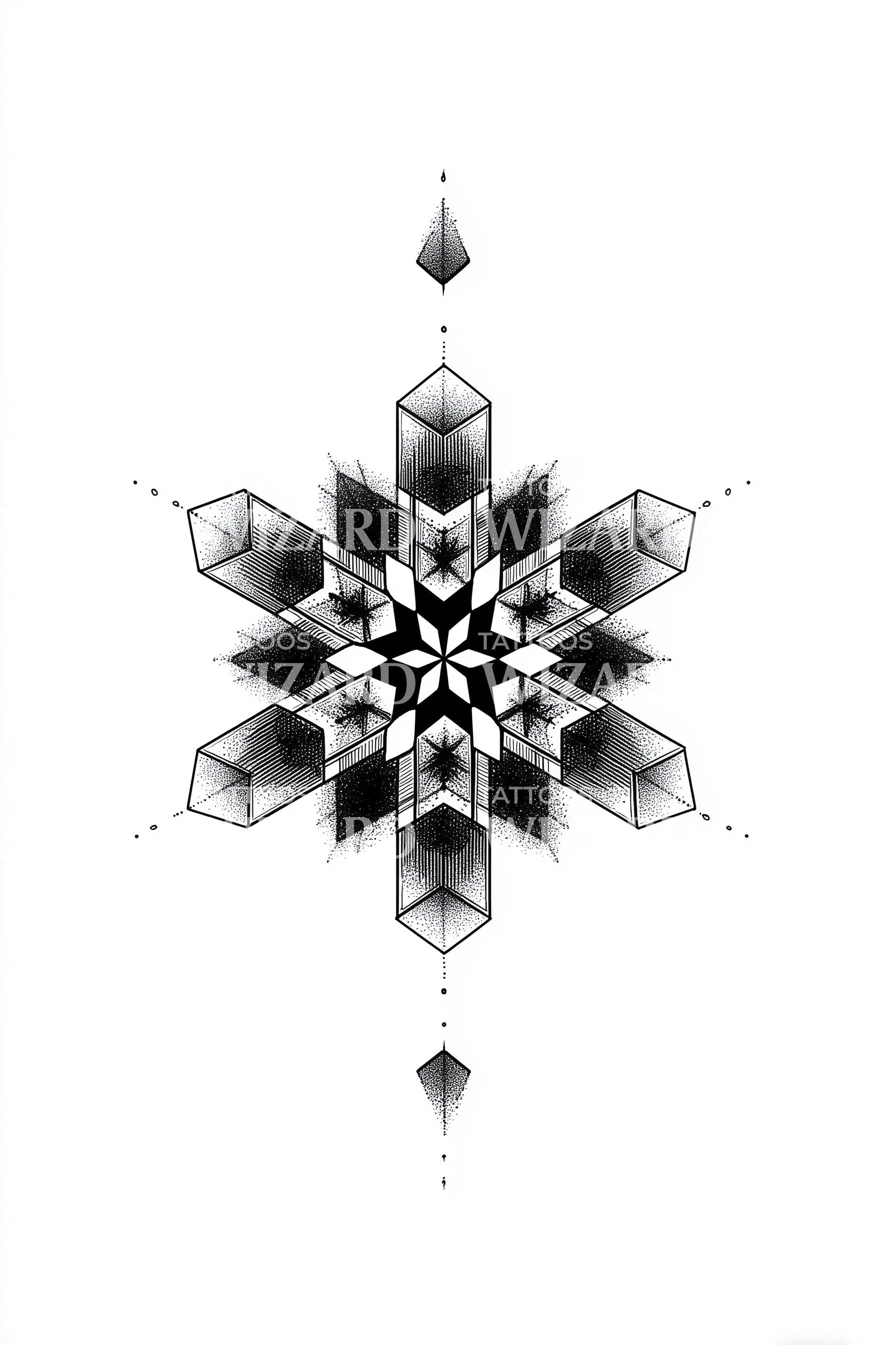 Fractal snowflake blooms in precise geometric abstraction, crystalline prisms radiating from a hexed star, shaded by delicate dotwork. Symbolizing purity, resilience, and singular identity, each facet honors transformation in winter’s quiet. Wearing it feels like crisp air in the lungs, focus sharpening, spirit clear, beautifully unbreakable and luminous.