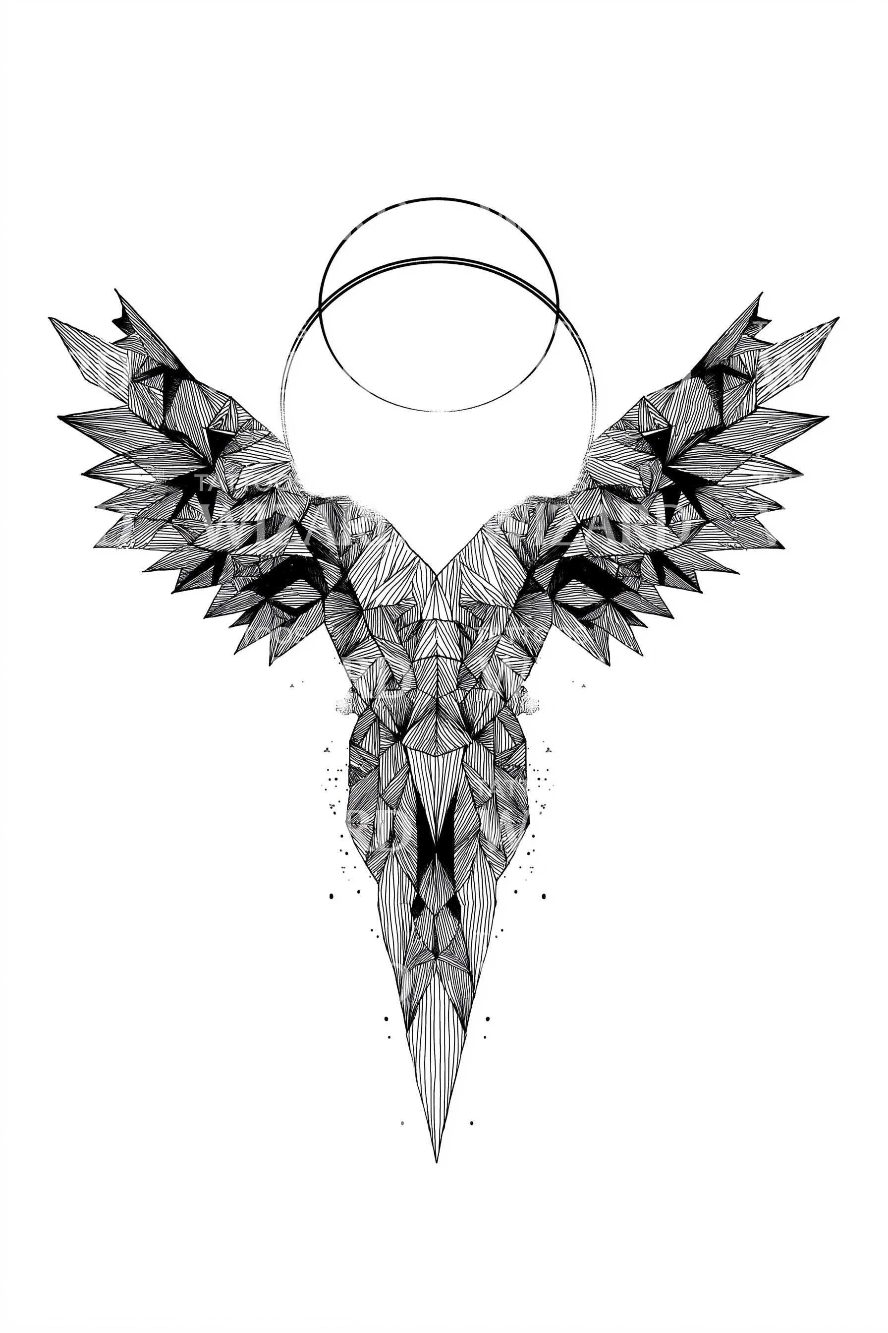 Facet-cut wings unfurl from a crystalline torso, etched in fine geometric lines and midnight shadows. Twin circles crown the form like orbiting halos, marrying ascension with equilibrium. Symbol of resilience, metamorphosis, and clarity, it wears like armor, giving the wearer poised courage, lifted breath, and purposeful flight.