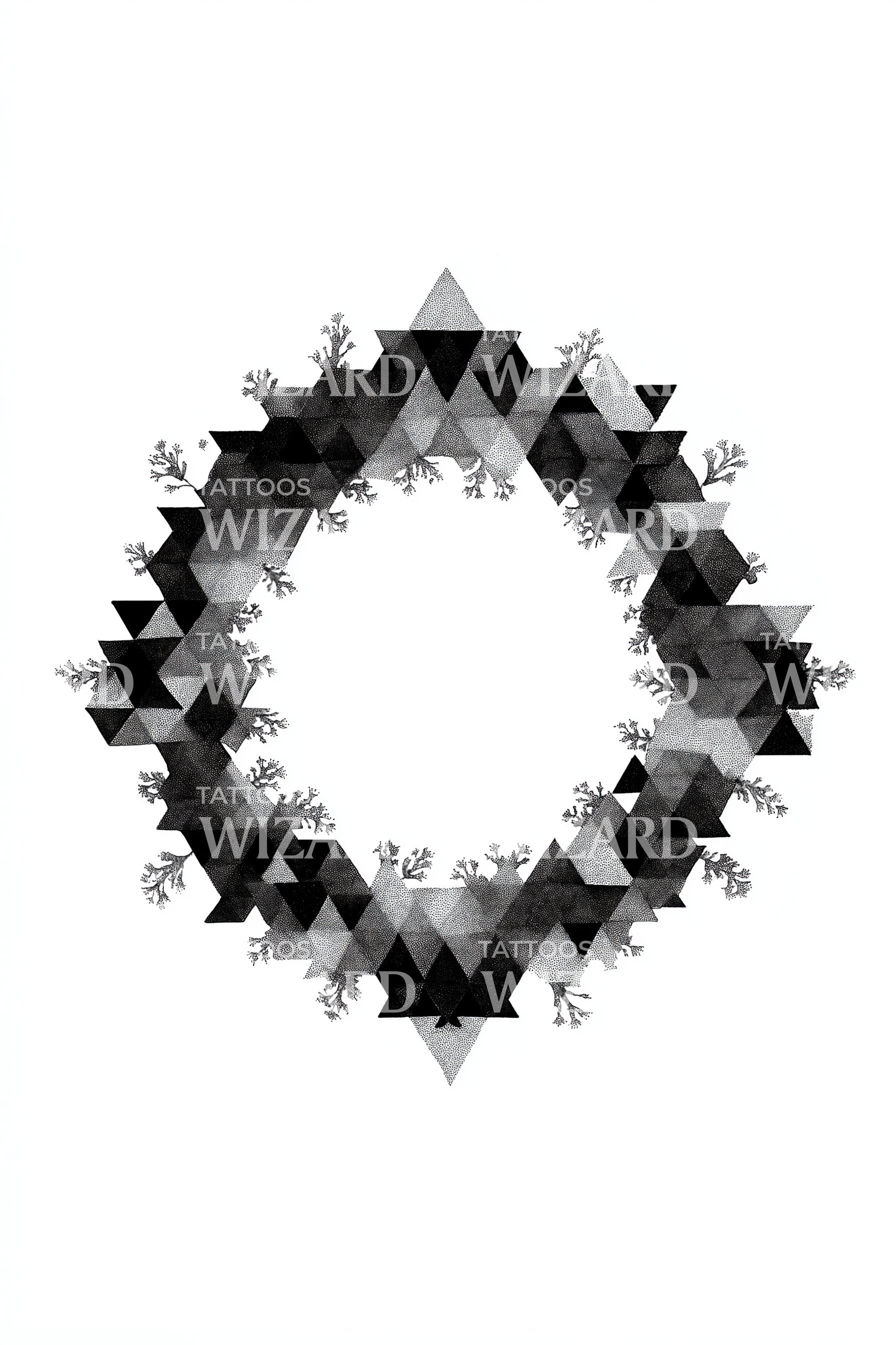 Faceted triangles form a midnight wreath, layered in soft stippled blacks and silvers, with frostlike branches glinting at the edges. The crystal ring honors cycles, clarity, and transformation, a holiday halo for the introspective. Worn close, it feels protective, serene, and quietly powerful, inviting renewal through winter nights.