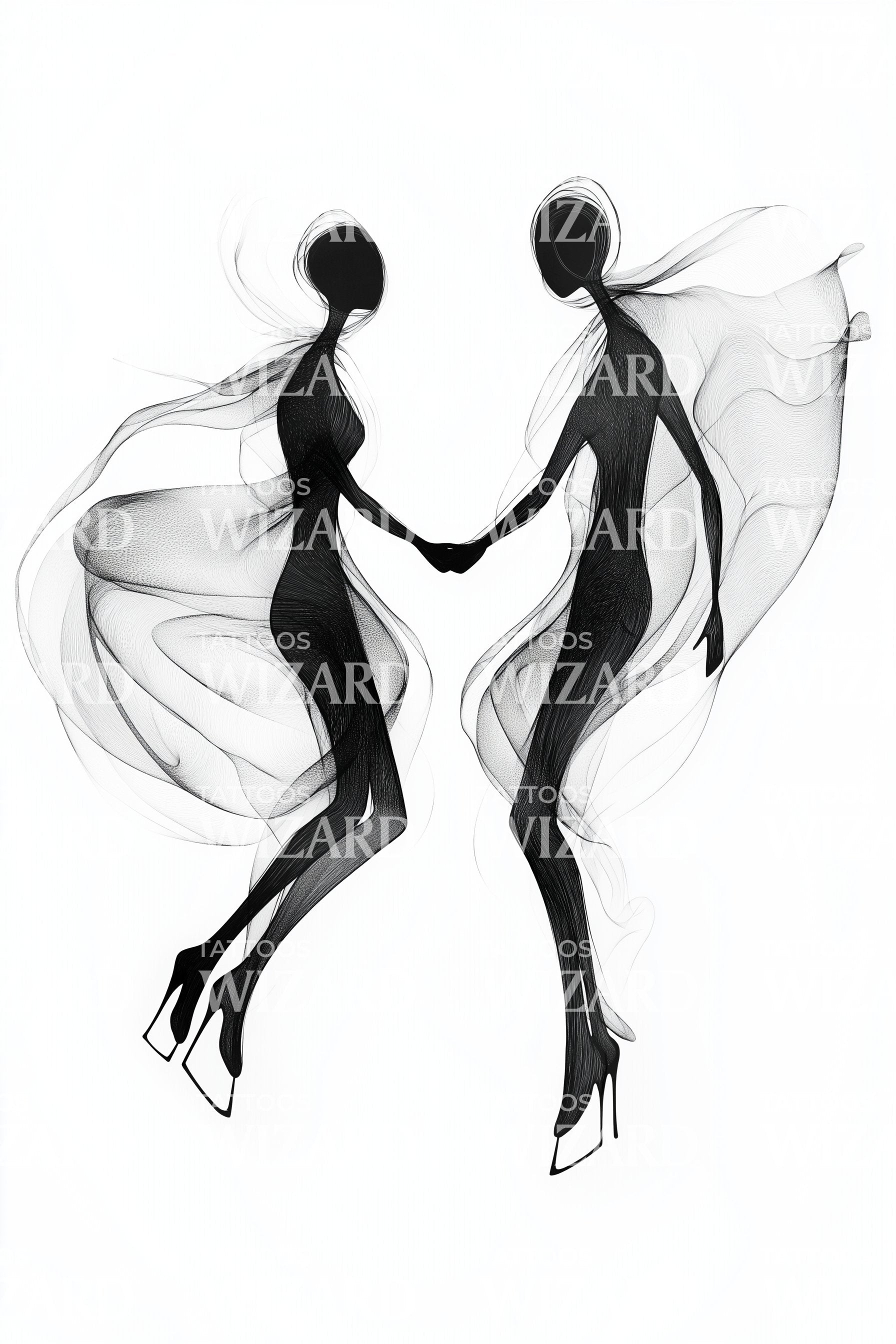 Ethereal black and grey silhouettes drift together, their gauzy lines like wind-blown veils and skater heels tracing soft motion. Two figures clasp hands, a winter waltz symbolizing devotion through cold seasons, balance and trust. Wearing it feels elegant, intimate, flowing, a quiet promise to keep dancing together, always.