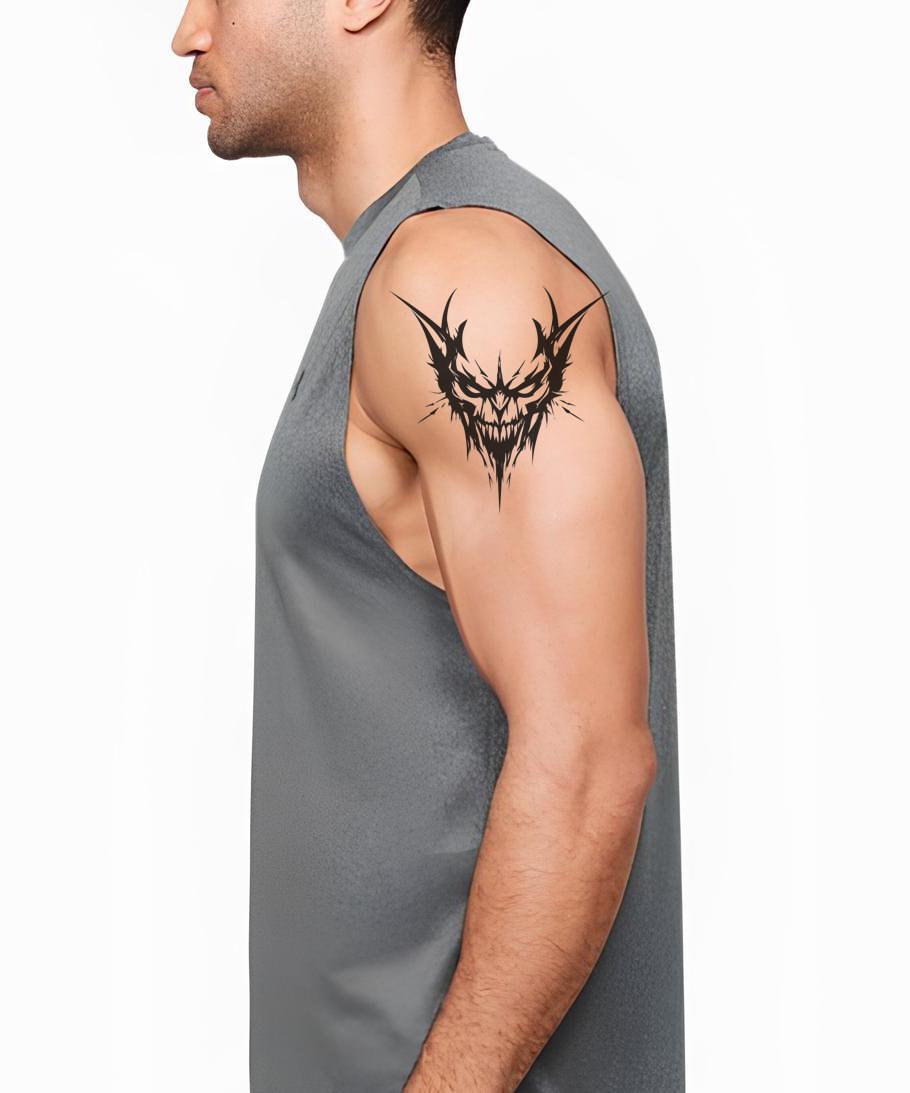 Introducing this minimalist tattoo design featuring demonic smiles, encapsulated within an aura of chaos, anger, and fear. Set in black & grey tones, it serves as an intriguing representation of internal conflicts and emotional turmoil. Ideal for those who seek to express strength amidst chaos.
