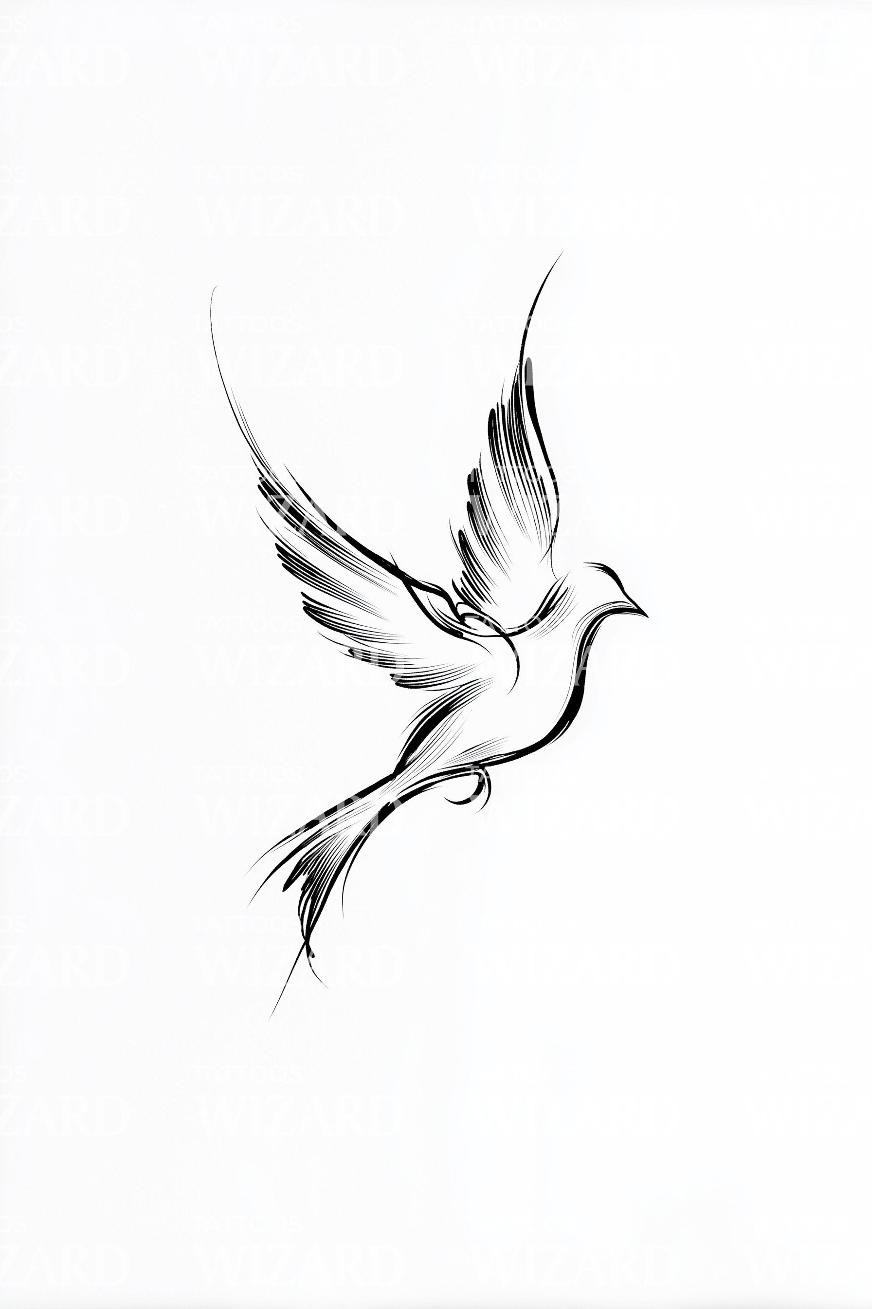 This exquisite fineline tattoo sketch features a realistic dove in flight - a universal emblem of freedom and light. Its dynamic soaring pose and meticulous detailing imbue a sense of serenity and inspiration. Perfect for those seeking a delicate bird tattoo that resonates with aspiration and liberation.