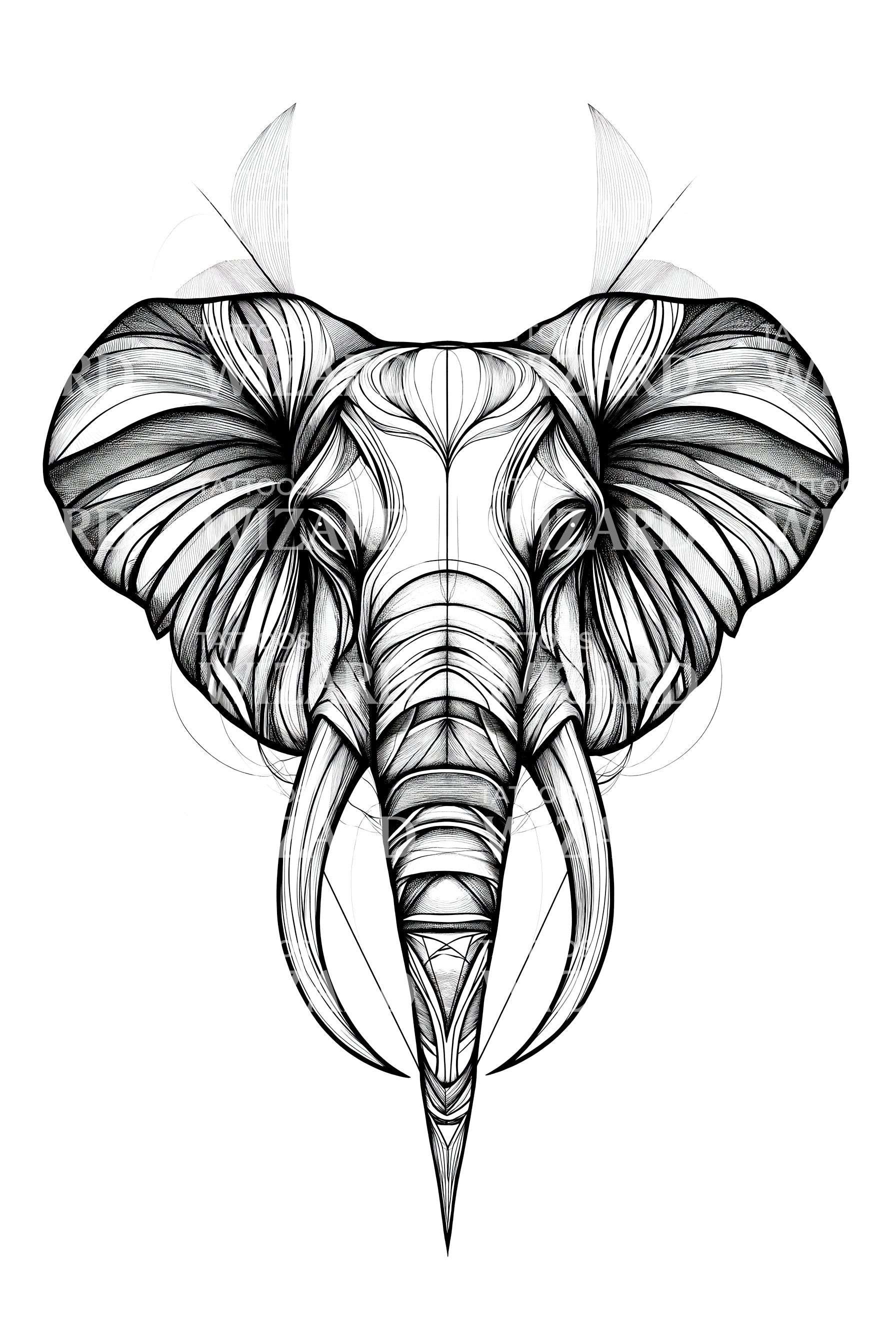 Regal elephant rendered in fluid illustrative linework, ears unfurling like sails and monumental tusks curving forward. Symbol of memory, wisdom, and steadfast guardianship, its gaze carries ancestral calm. Wearing this design feels grounded and courageous, a quiet crown for the skin, honoring strength, dignity, and wild grace.