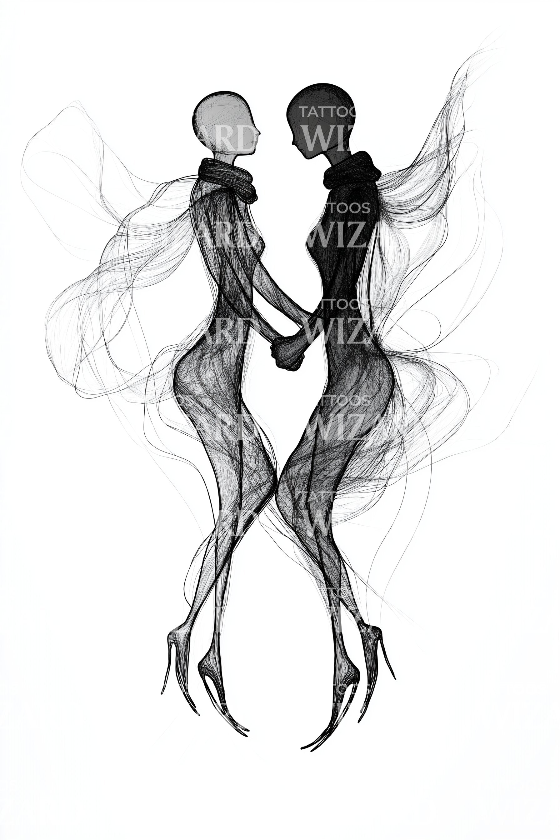 Black&grey wisps sketch two faceless lovers, bodies woven from smoke, fingertips meeting in a poised embrace. Abstract lines drift like breath, suggesting souls crossing. This tattoo symbolizes connection, equal parts romance and mystery. Wearing it feels like carrying a quiet vow, a tender spark that never fades.