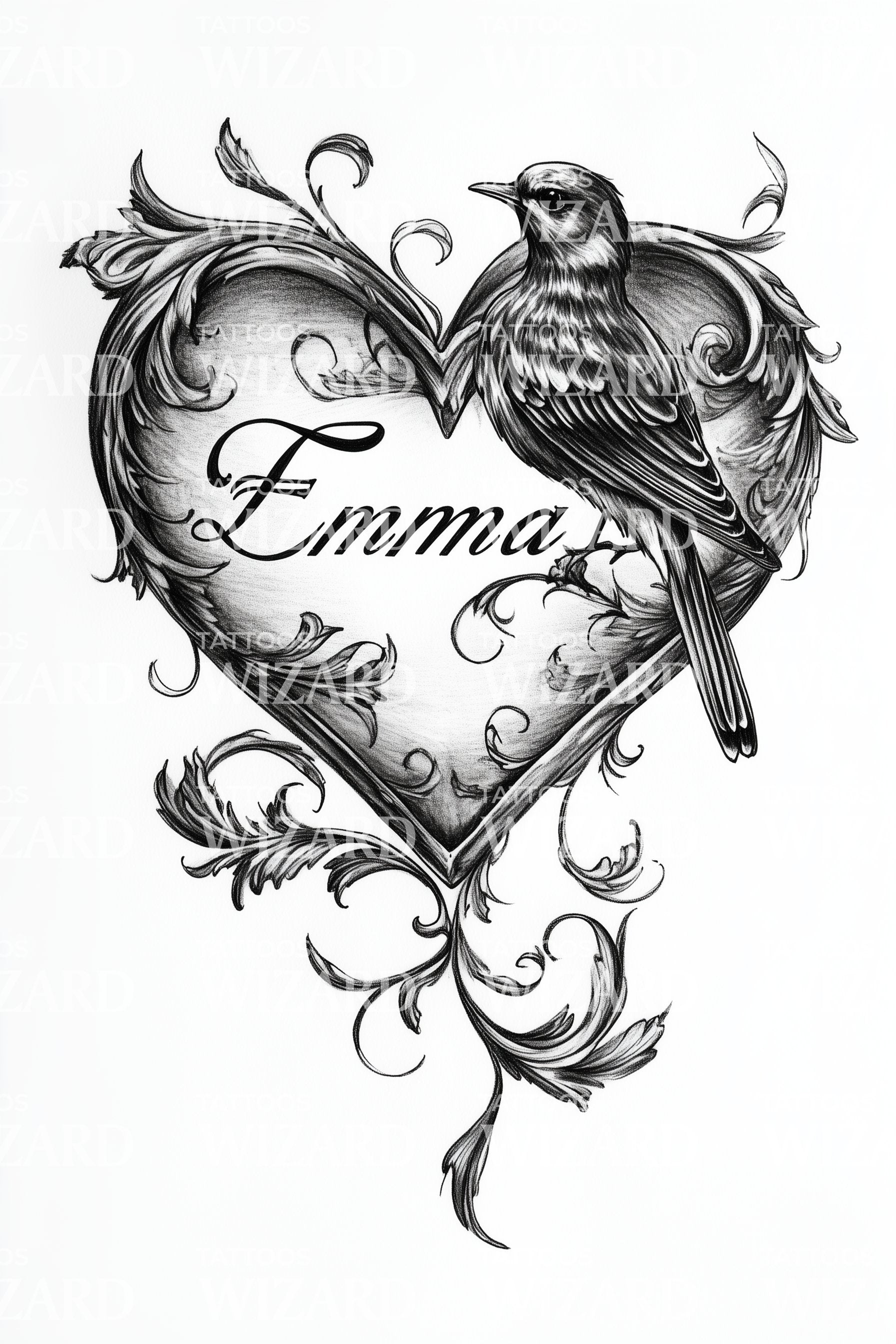 Ornate black-and-gray filigree curls into a sculpted heart, cradling the name Emma while a detailed songbird perches on its rim. The heart speaks of devotion, the bird of freedom and guardianship, the scrolls of timeless grace. Worn daily, it feels protective, uplifting, and deeply personal.