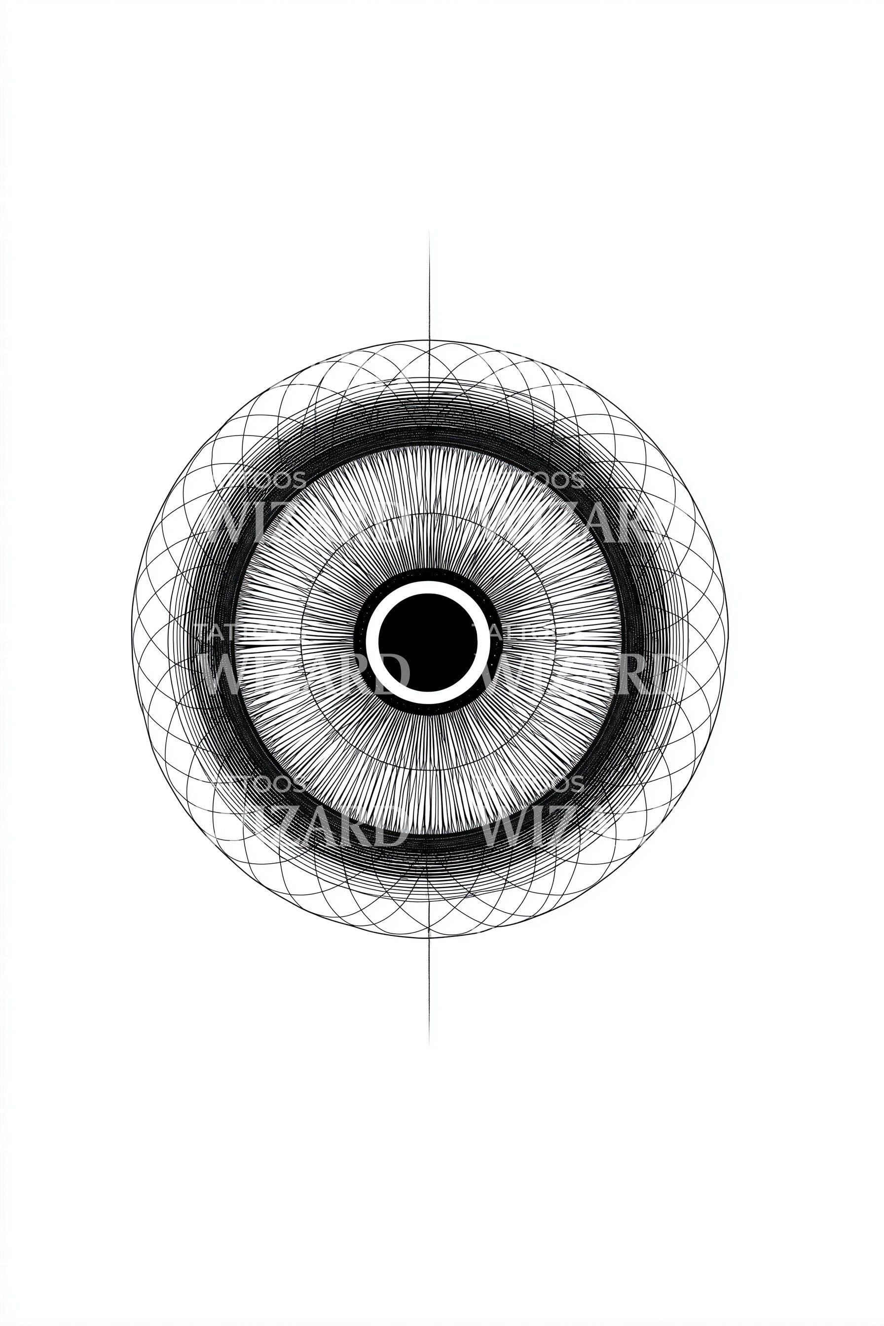 Radiant concentric circles form a fine-line mandala, an all-seeing eye with delicate dotwork and precise geometry. Lines radiate like an iris, centering intention and vision. Symbolizing clarity, protection, and insight, this piece feels grounding and awake, a quiet compass guiding focus, curiosity, and courageous self-witnessing, each day forward.