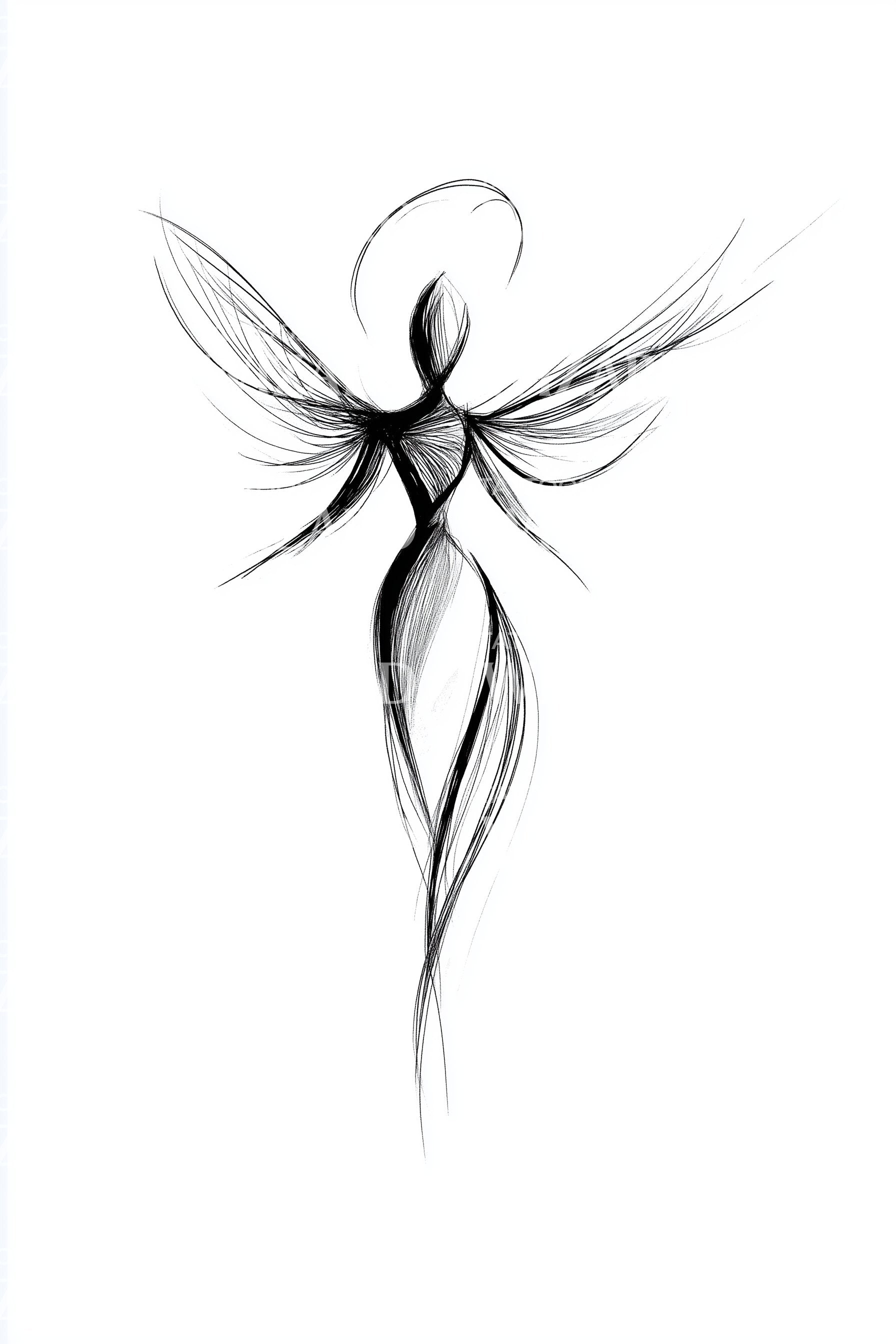 Ethereal linework sketches a winged fairy, body carved from sweeping strokes, crowned by a soft halo. The abstract form suggests Christmas light, wishes taking flight, and grace mid-breath. Symbolizing wonder, guidance, and rebirth, this design gifts its wearer buoyant magic, quiet courage, and whimsical serenity through winter nights.