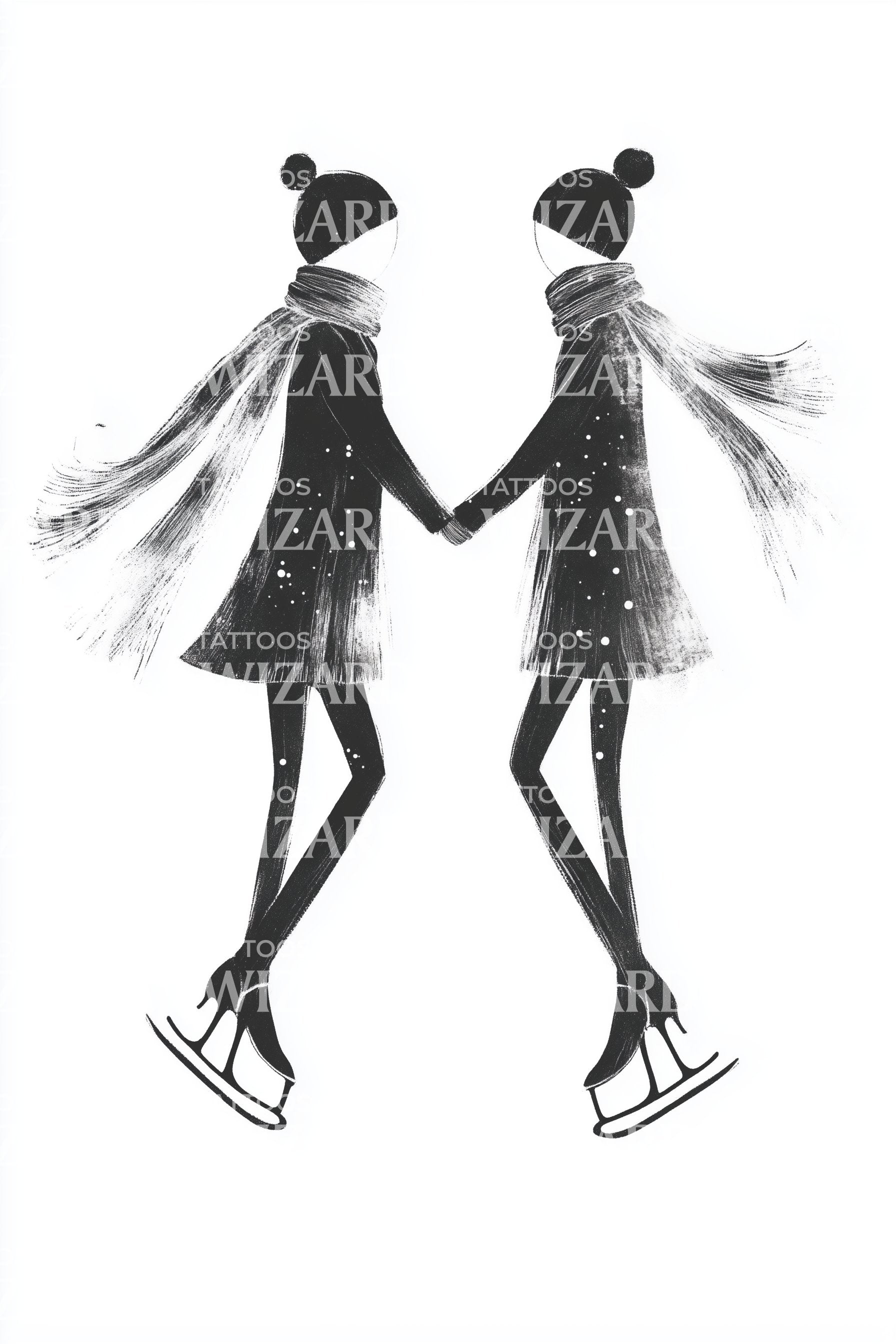 Frost-kissed silhouettes glide hand in hand, beanies and long scarves sweeping like comet tails over sleek skates. Minimal black-on-white lines celebrate winter fashion and twin style. Two skater girls mirror loyalty and shared courage, a pact on ice. Wearing it feels brisk, elegant, fiercely connected, with lasting friendship.
