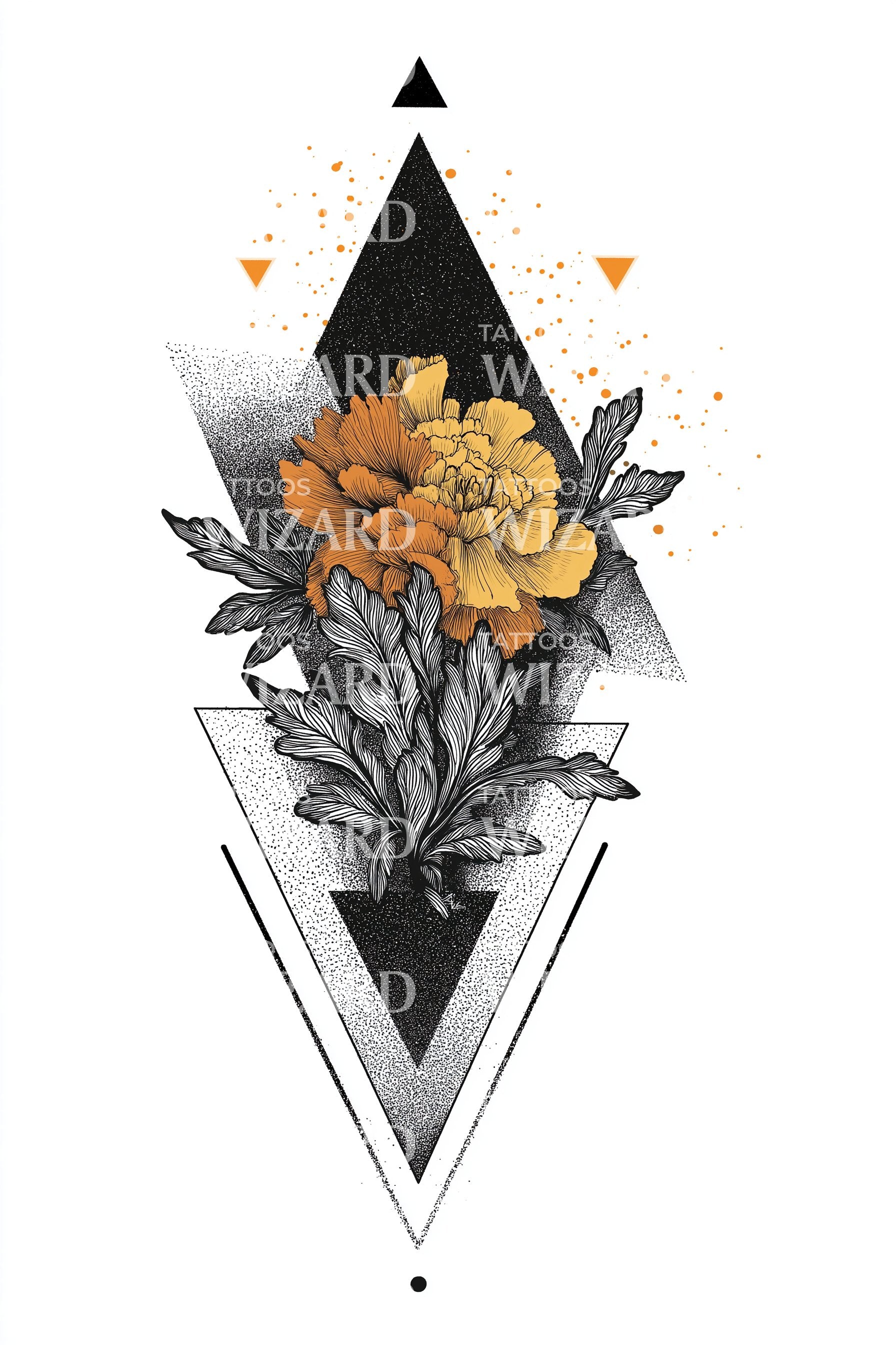 This captivating tattoo design effortlessly intertwines geometry and nature. The striking contrast between the vivid orange floral elements, sharp triangular shapes, and the bold arrow provides a unique aesthetic. An illustrative piece full of depth and symbolism, it's perfect for those wishing to showcase their passion for art and life.