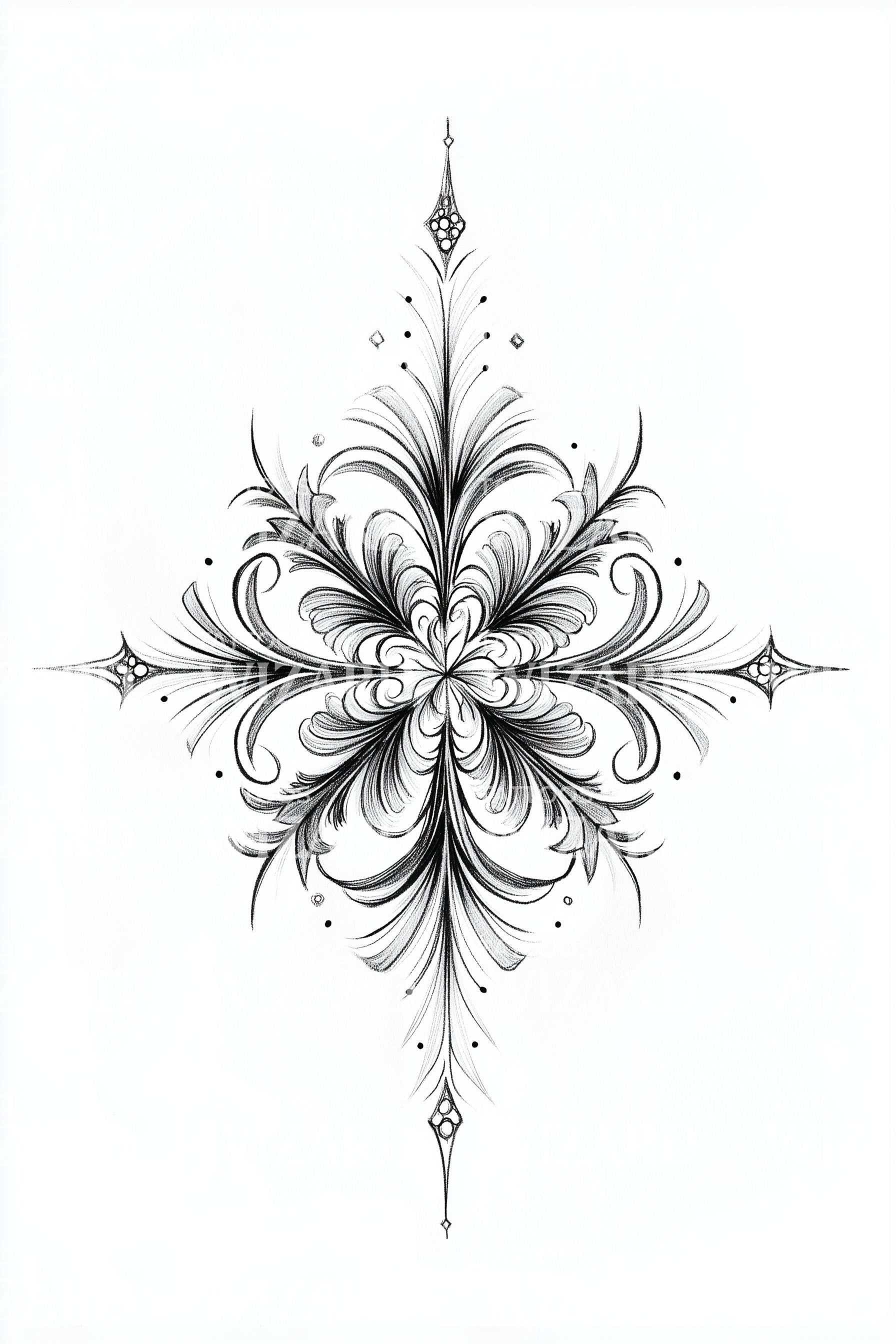 An ornate tattoo design featuring a baroque cross framed by flowing flourishes and delicate filigree. Symmetrical detailing creates regal depth, while crisp black ink highlights every curve. Ideal for chest, forearm, or back placements, this ornamental piece blends classic devotion with sophisticated artistry and timeless elegance and grace.