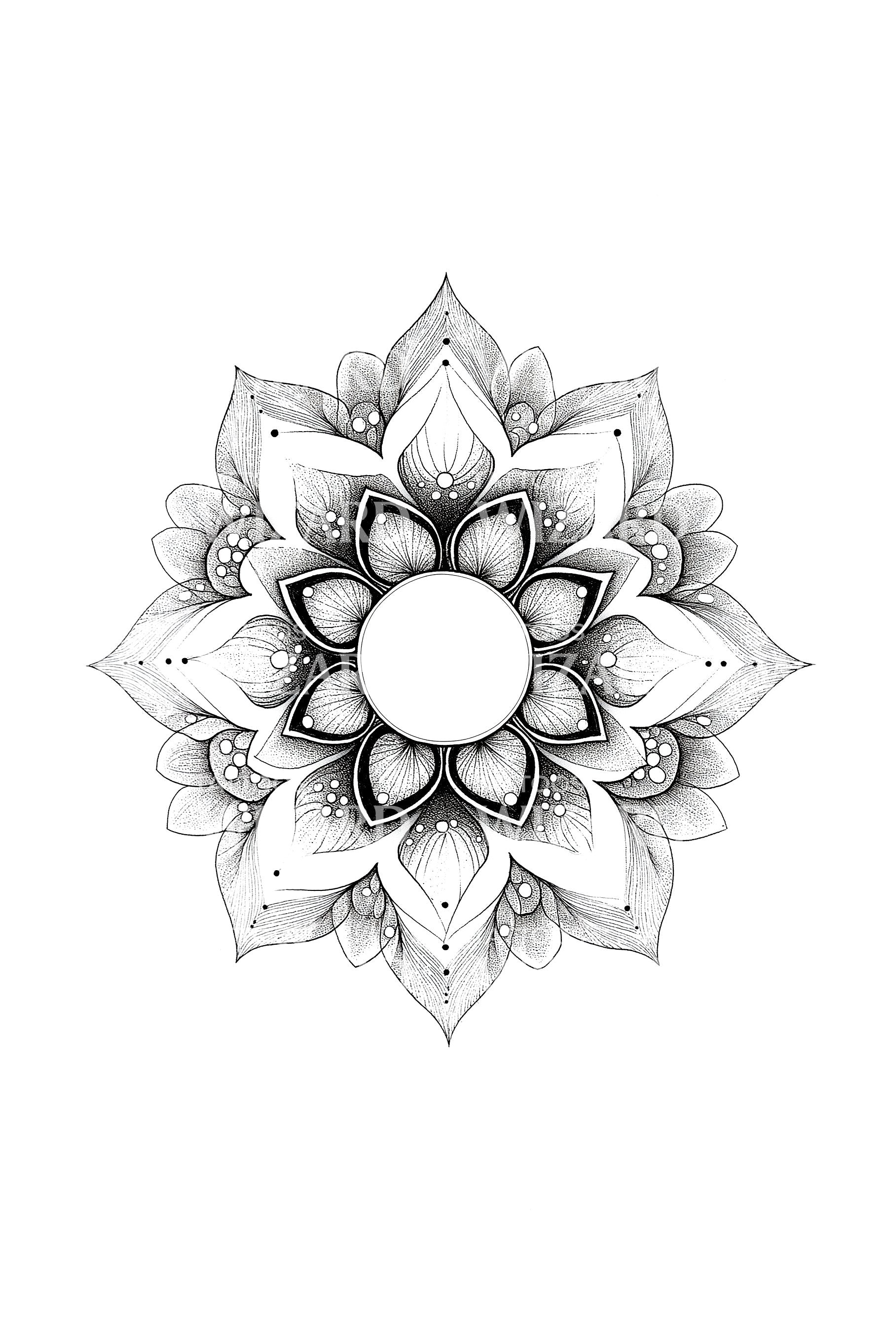 Radiant lotus mandala blooms in fineline detail, layered petals circling a tranquil center with delicate dotwork and ornamental drops. Symbolizing rebirth, balance, and sacred harmony, the flower invites quiet clarity. Wearing it feels like carrying a calm compass, steadying the heart while illuminating personal growth and graceful strength.