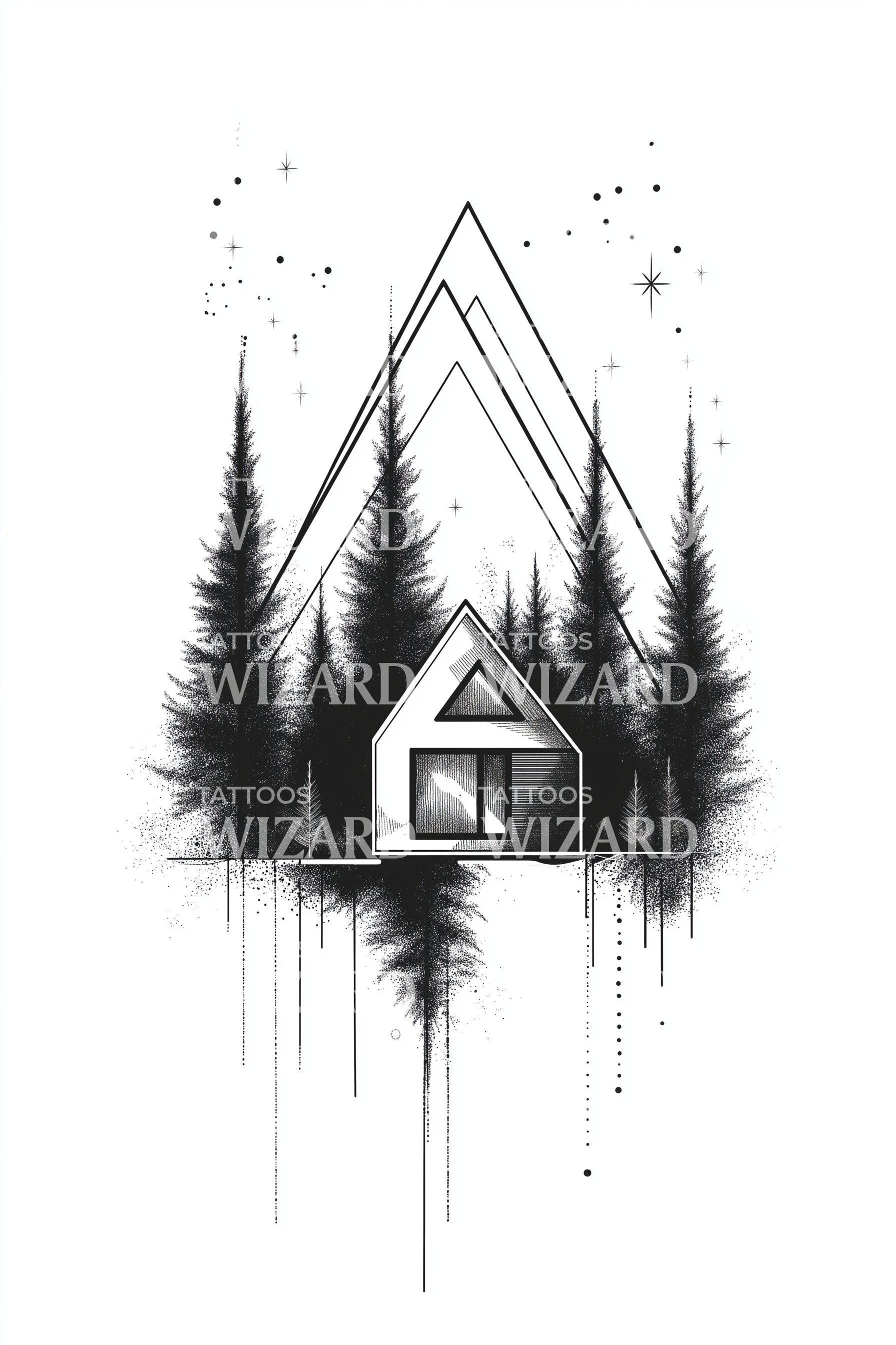 Ink-washed pines cradle a minimalist cabin, framed by geometric mountains and a star-pricked winter sky. Dripping shadows mirror below, a quiet reflection of solitude and return. Symbol of refuge in the wild, this landscape carries calm courage, inviting its wearer to breathe, listen, and belong.