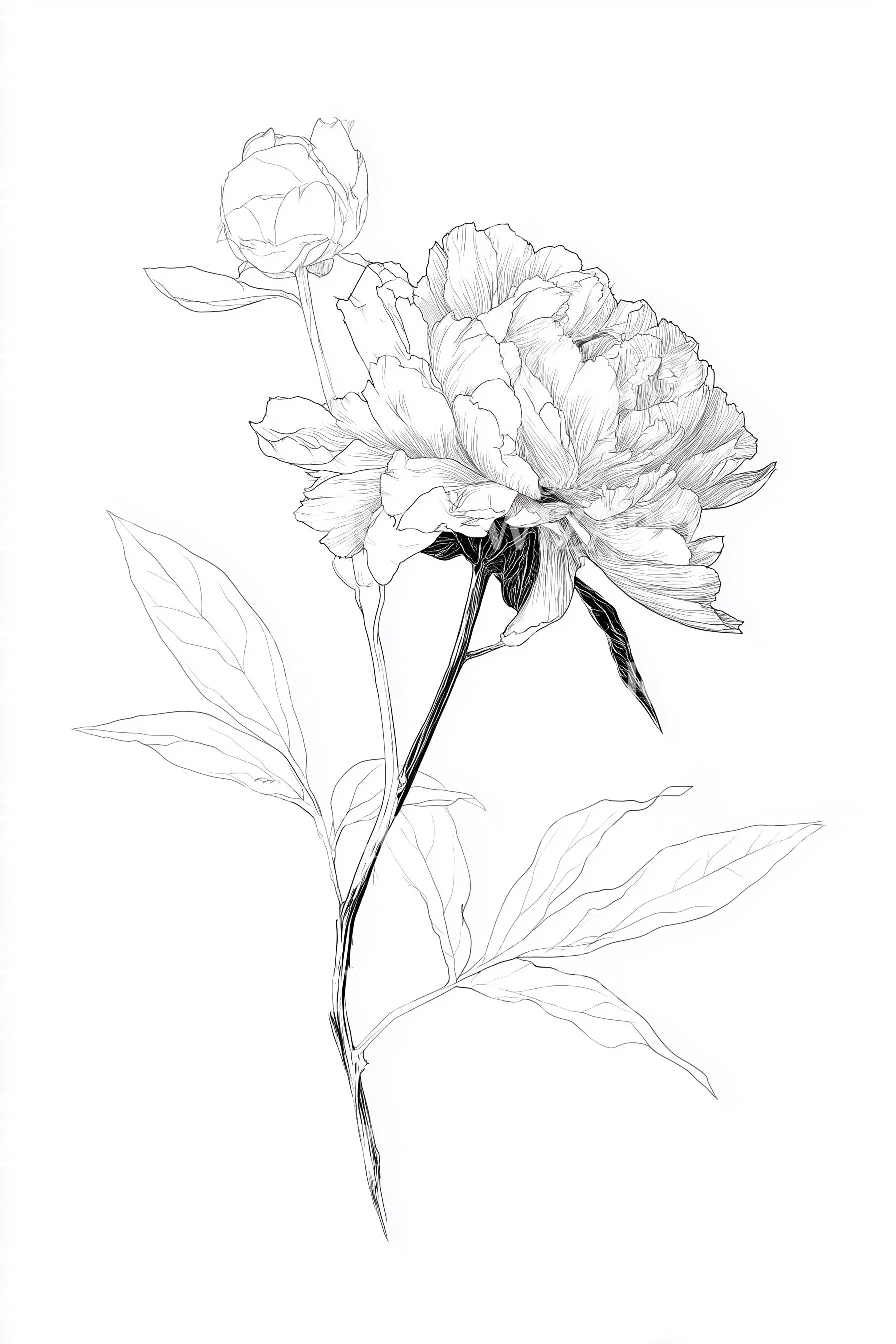 Fineline peony blossom in airy contour, petals layered with whispery shading, a slender stem lifting tender leaves and a budding promise. Symbol of renewal, grace, and quiet strength, this botanical speaks to unfolding potential. Worn on skin, it feels serene, delicate, and steadfastly alive, grounded yet softly radiant.