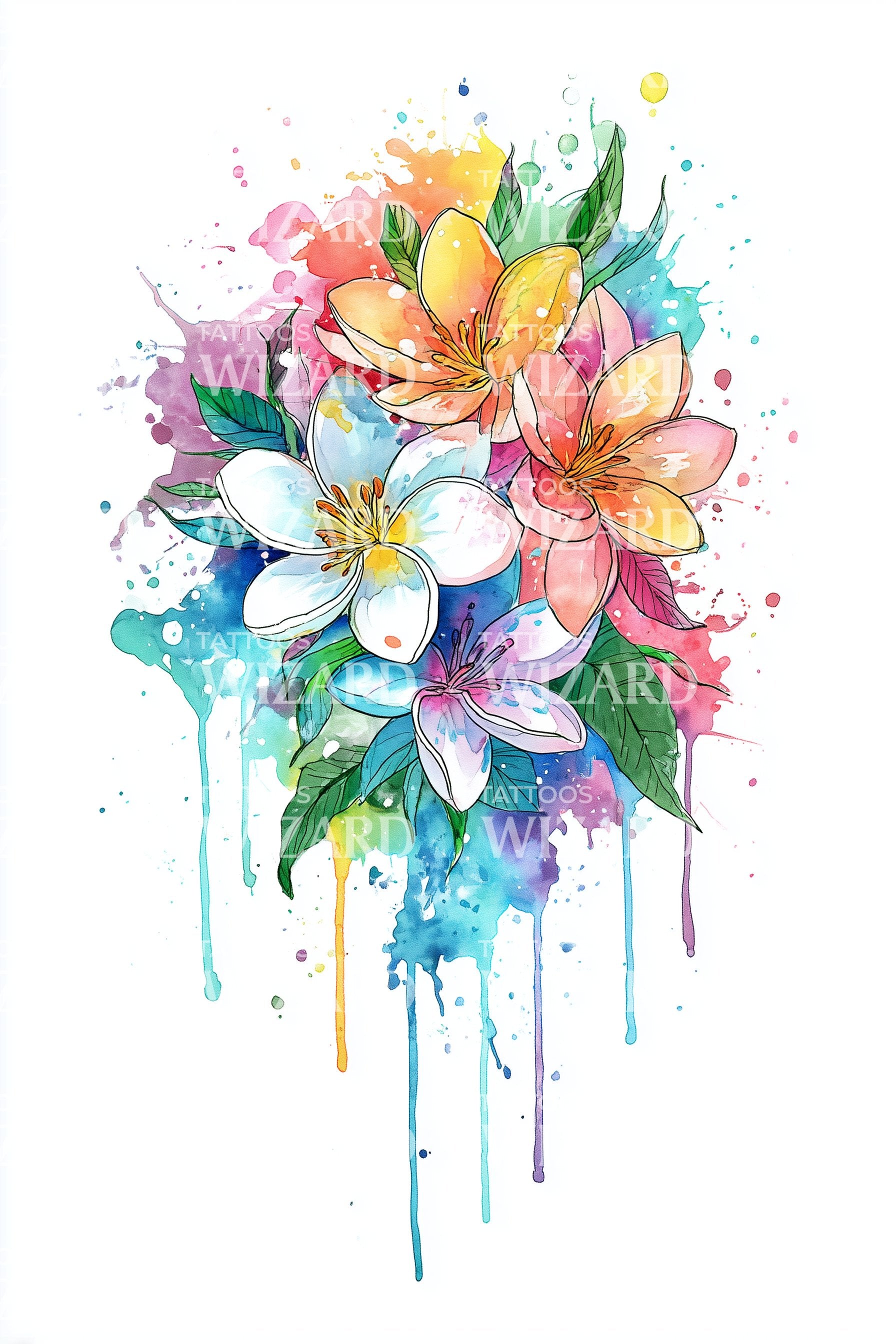 Experience the mesmerizing blend of prismatic hues with this watercolor tattoo design. It showcases a vibrant burst of garden-inspired, floral elements, artistically dripping in diverse colors. This tattoo translates the thriving beauty of gardens into an avant-garde, color-drenched spectacle. Perfect for those who appreciate unique, artistic expressions.