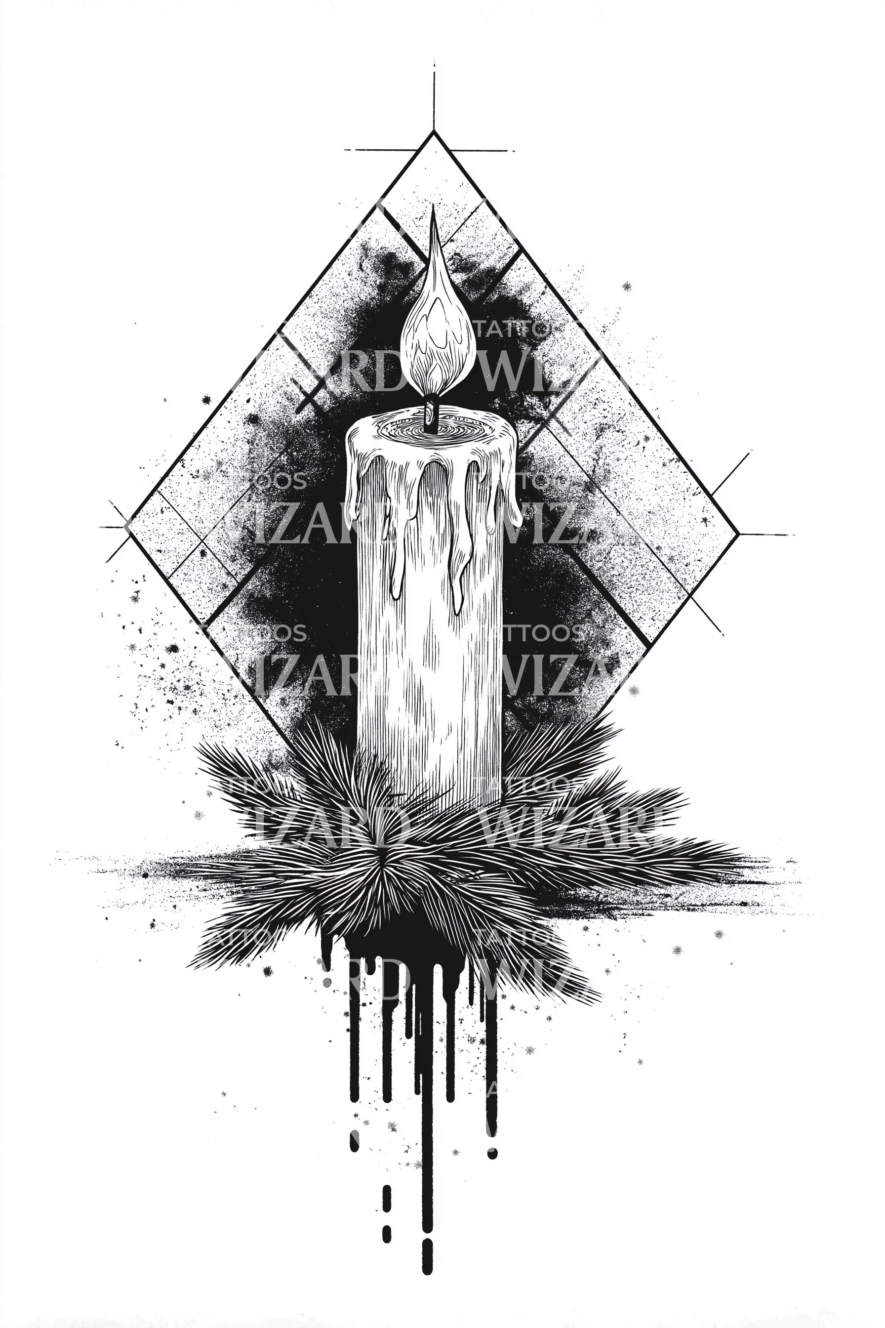 Geometric blackwork candle rises within a diamond halo, wax textured and framed by ornamental evergreens and ink splatter. The flame symbolizes guidance, remembrance, and winter hope; the diamond focuses clarity and intention. Evergreen needles echo endurance. Wearing it feels warm, centered, quietly festive, Christmas calm, a steady light through dark.