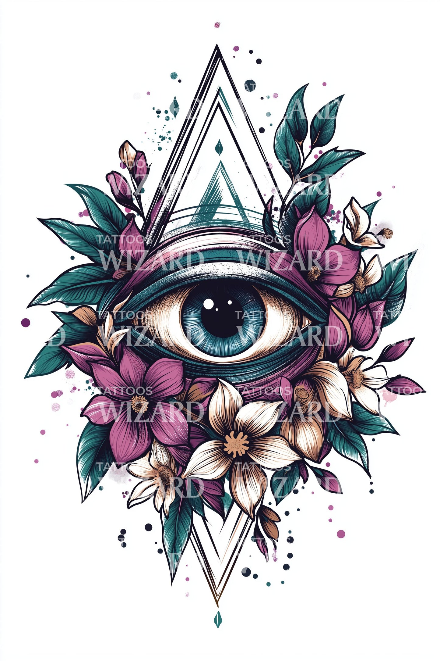 Unveil your mystic side with this geometric tattoo design. The amalgamation of eyes and flowers embodies a confluence of vision and beauty. Crafted with pristine precision, the triangles add an edgy touch, making it a perfect choice for those who wish to depict an enigmatic aura.