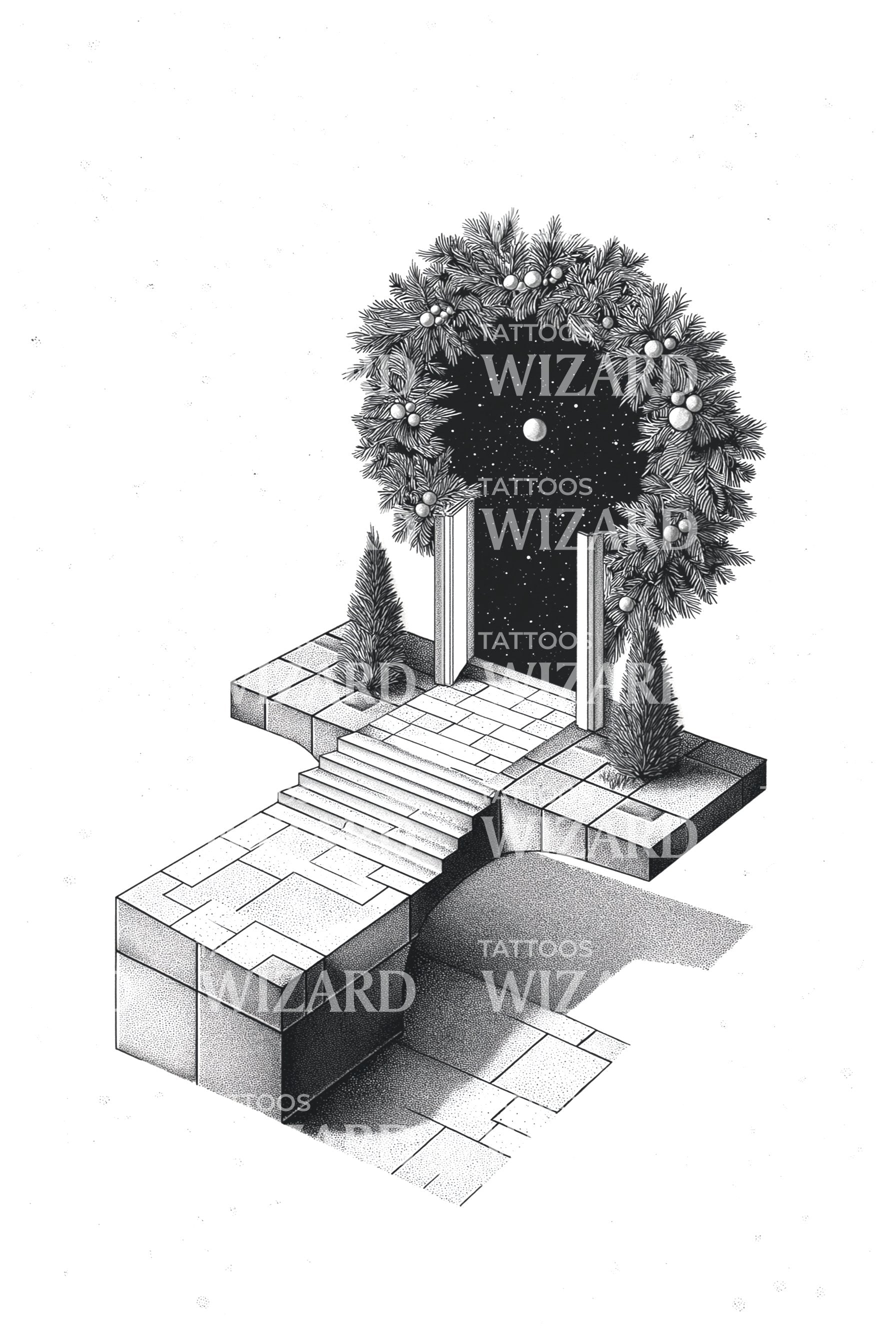 Stone steps rise across precise blocks toward a starlit portal crowned in pine and pearl-like orbs, rendered in delicate dot shading. The geometric illusion suggests passage, discipline, and rebirth. Wearing it feels like carrying your own threshold, quiet courage in motion, grounded structure meeting infinite possibility.