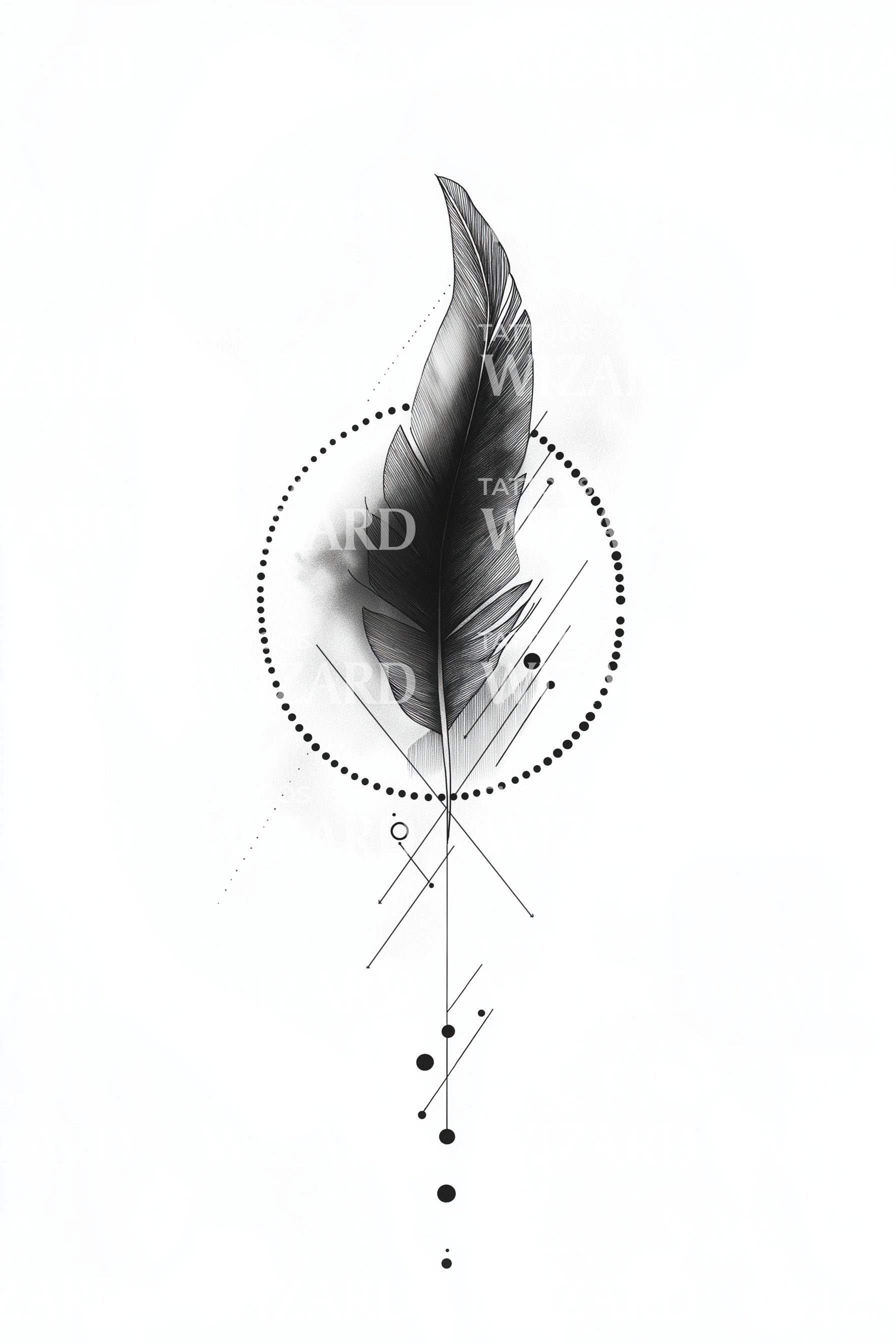 A fineline feather rises within a dotted halo, intersected by minimalist geometry and soft ink haze. The plume symbolizes lightness, guidance, and messages between worlds, while the precise lines honor balance and intention. Worn close, it feels like a quiet blessing, steadying breath and lifting spirit.