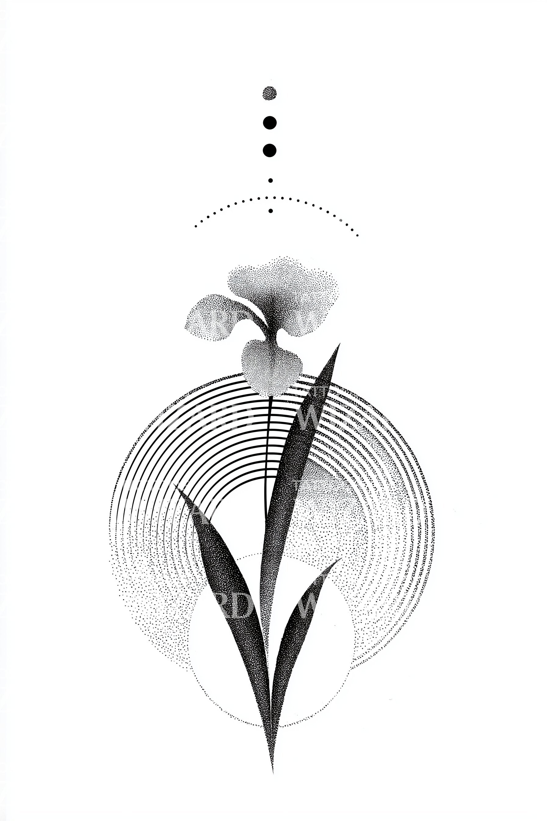 Immerse in the ethereal beauty of this modern tattoo design. The geometric dotwork forms a halo encapsulating the delicate orchid flower, adding an element of mystique. It's a blend of traditional symbolism with a contemporary edge, perfect for tattoo enthusiasts seeking a unique visual narrative.