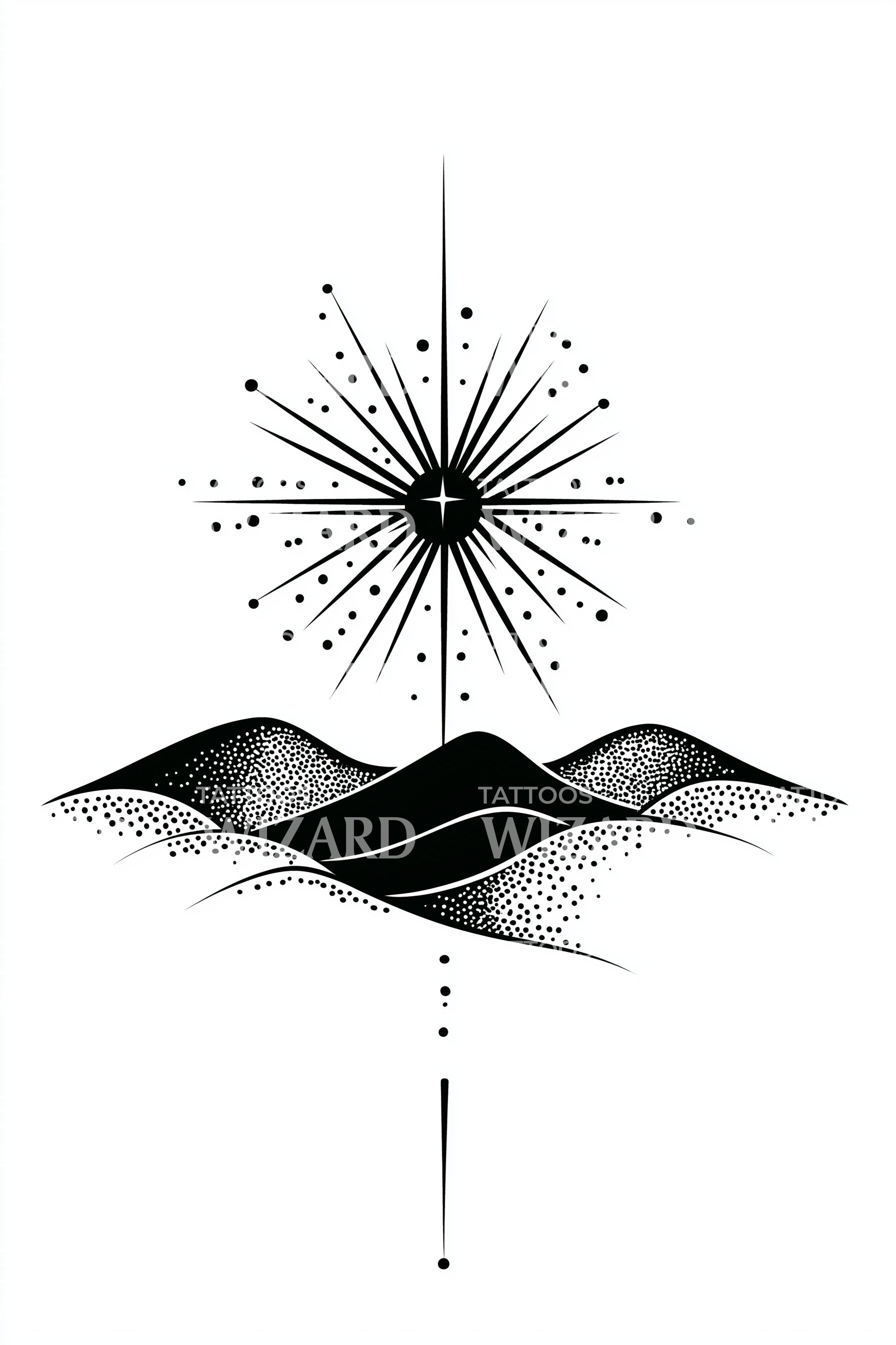 Minimal dotwork mountains rise beneath a radiant night star, gradients of stippled shadow forming a calm horizon. Mountains promise ascent and perspective; the central star speaks of guidance and the spark that survives darkness. Worn close, this design feels like quiet altitude, steadying breath, inviting purposeful steps forward.