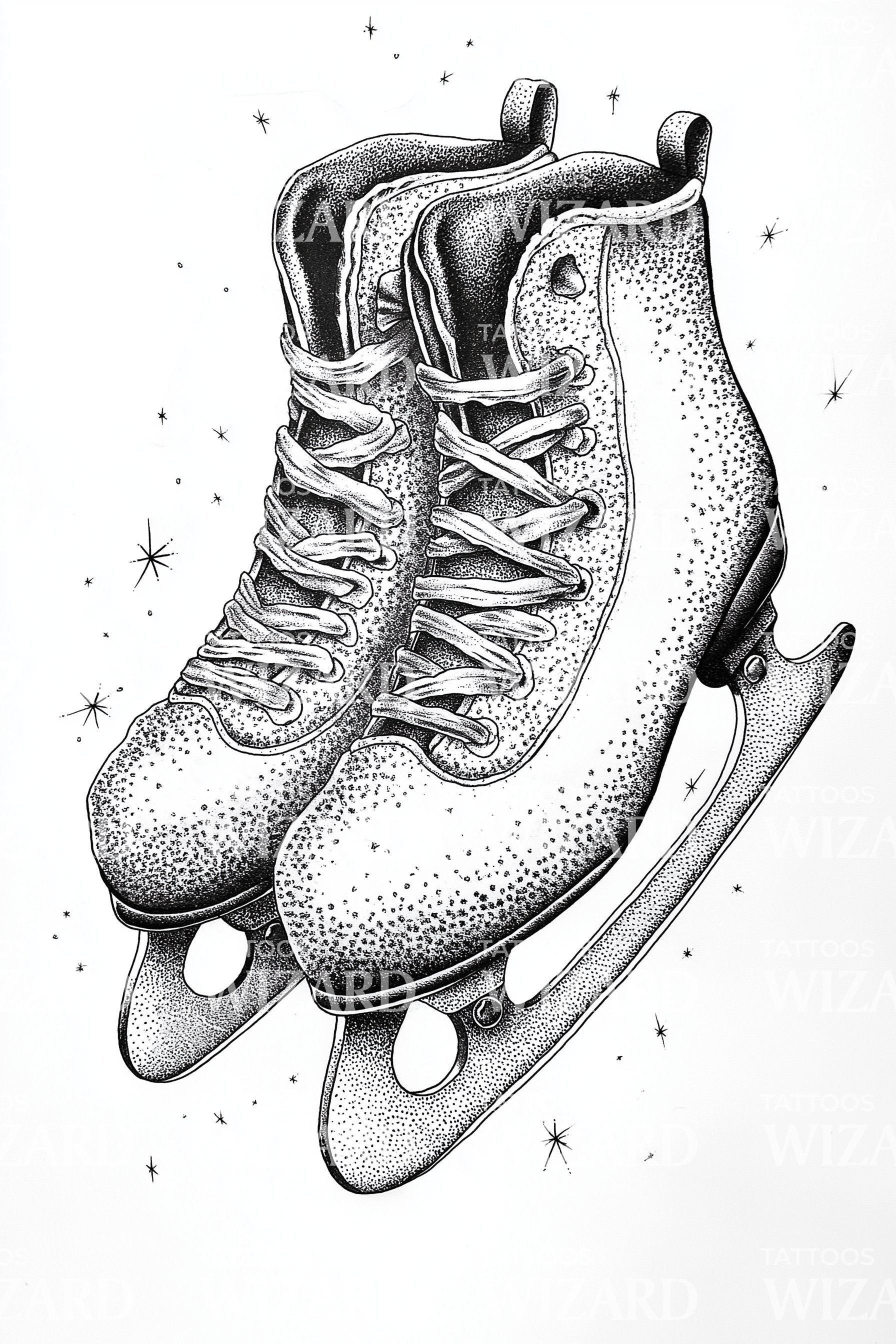 Dotwork skates shimmer with frosty stipples and starry specks, evoking vintage rinks and crisp night air. Laces weave like memories, blades trace courage on ice. Symbolizing motion, grace, and playful winter sport, this retro holiday emblem wraps the wearer in nostalgia, calm focus, and spirited momentum and joy.