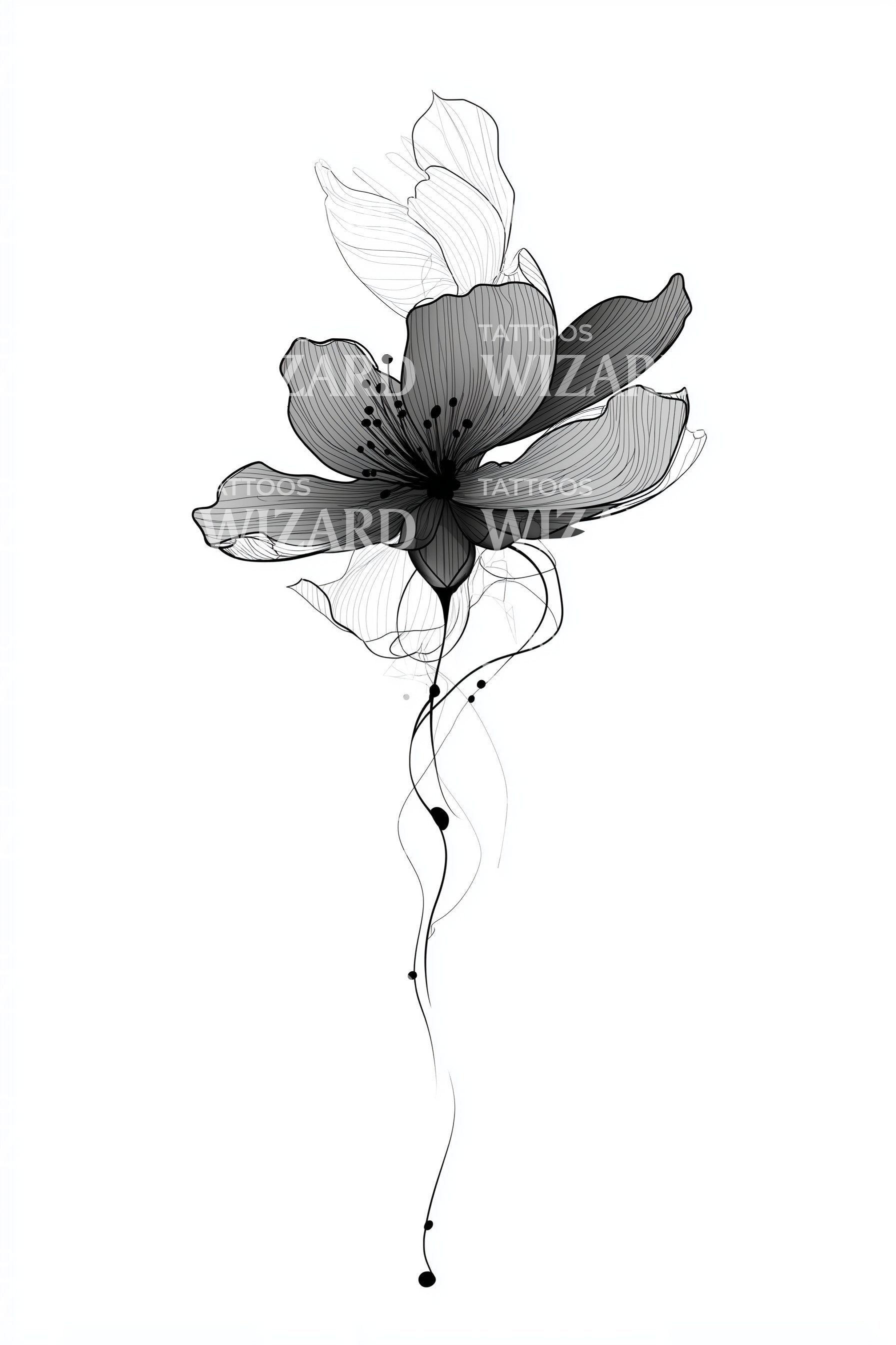 Minimalist ink sketch of a blossoming flower, petals layered like translucent whispers, lines breathing with soft motion. A slender stem meanders downward, kissed by inky droplets, symbolizing growth through quiet resilience. Worn on skin, it feels like calm courage, a tender reminder to unfold, stay light, and bloom.