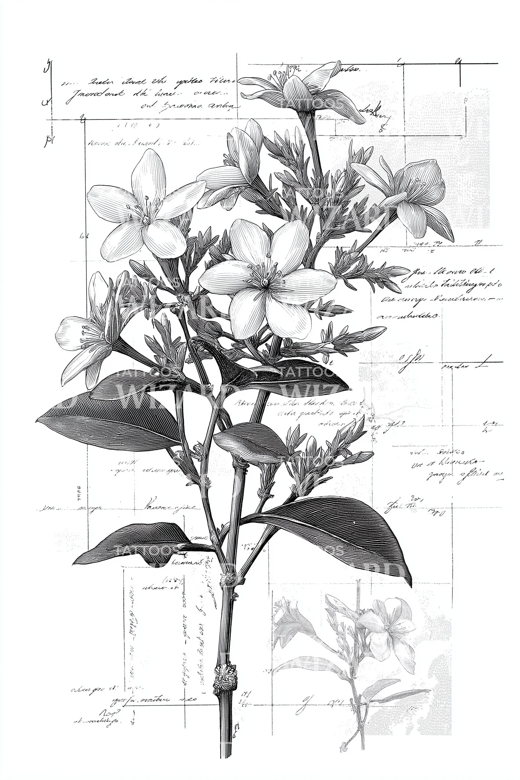 Immerse in the exquisite beauty of this fineline tattoo design, featuring a sleek jasmine sketch. The botanical blueprint is masterfully created with meticulous line work, capturing the delicate allure of the beloved flower. Perfect for those seeking an elegant and unique body art piece.