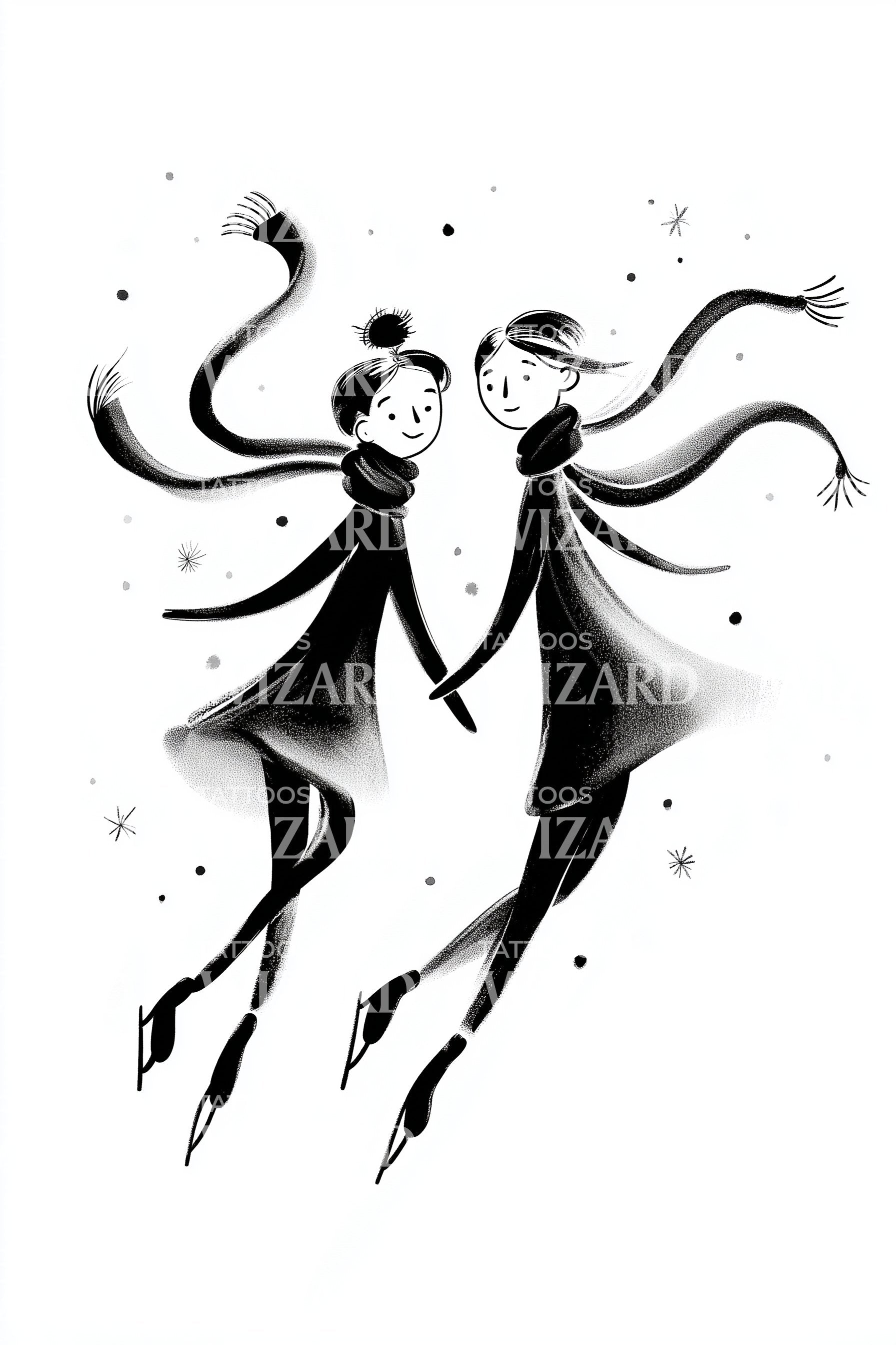 Frosty ink lines sketch two friends gliding on skates, scarves streaming, snow dotted like confetti. Their joined hands echo loyalty, movement becoming a joyful winter dance. A celebration of shared balance and trust, this design wraps the wearer in buoyant warmth, graceful steps, steadfast companionship, and everyday courage.