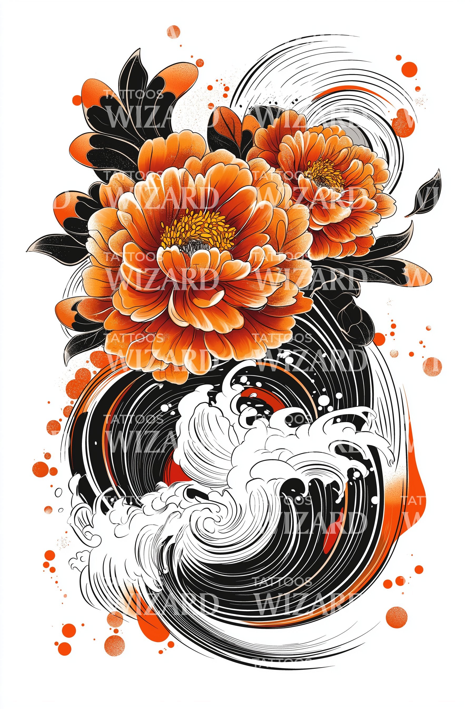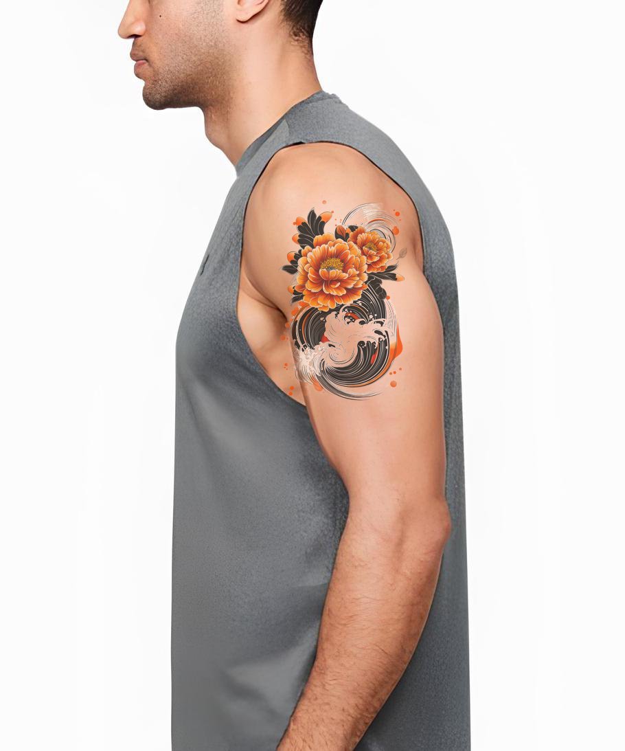 Immerse yourself in an oriental fantasy with this striking Japanese tattoo design. The piece features a majestic Koi boldly swimming amidst delicate Peony blooms, with its swirling flow expertly captured in rich ink. It's an impressive symbol of resilience and beauty steeped in oriental tradition.