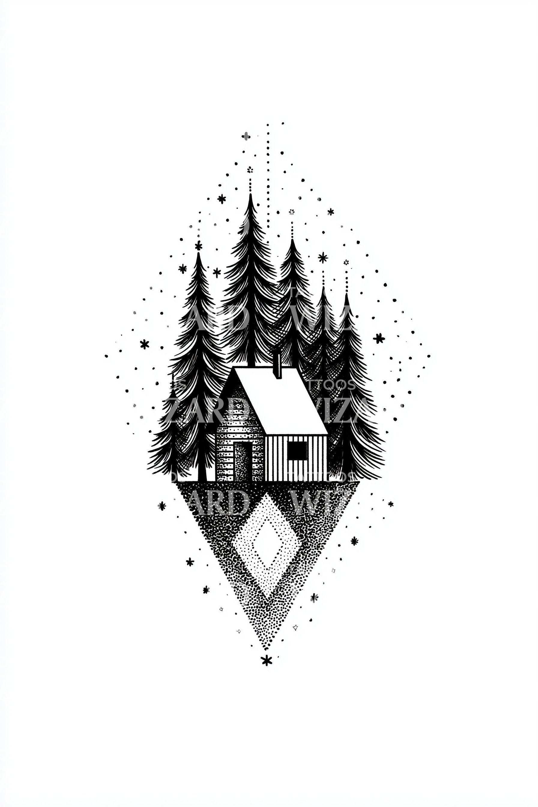 Frost-kissed blackwork dotwork forms a diamond scene: a cabin nestled among towering pines, snow drifting like constellations. Below, an inverted diamond mirror suggests a frozen lake. Symbolizing sanctuary and reflection, this design carries resilience and clarity, letting its wearer feel rooted, calm, and wonderfully alive through winter.