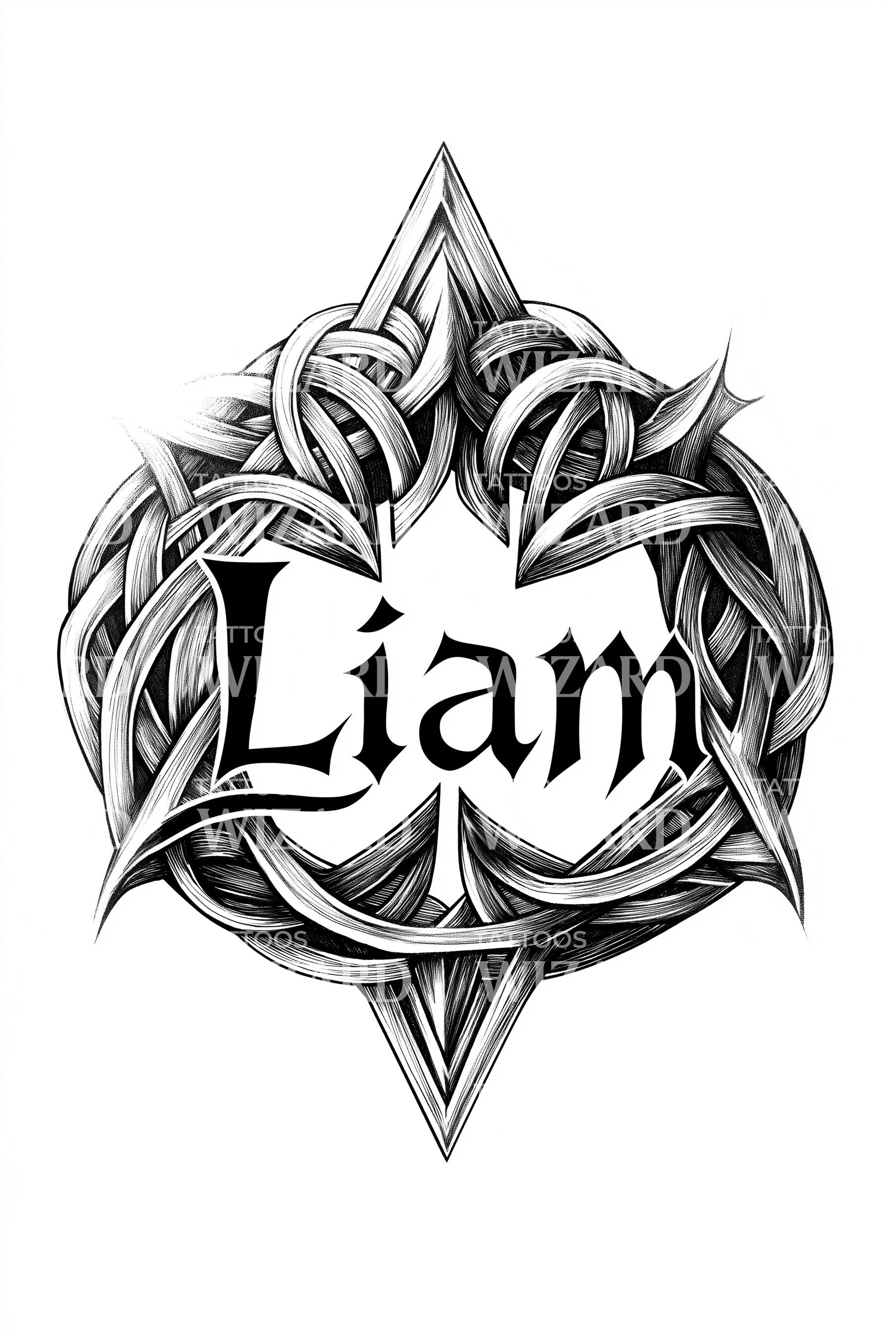 Celtic interlace forms a star-tipped crest, a dark, braided knot circling the bold name Liam like a heraldic badge. Endless strands speak of lineage, loyalty, and protection, weaving past to future. Wearing it feels grounded and brave, a personal oath carried in ornament, strength bound to story.