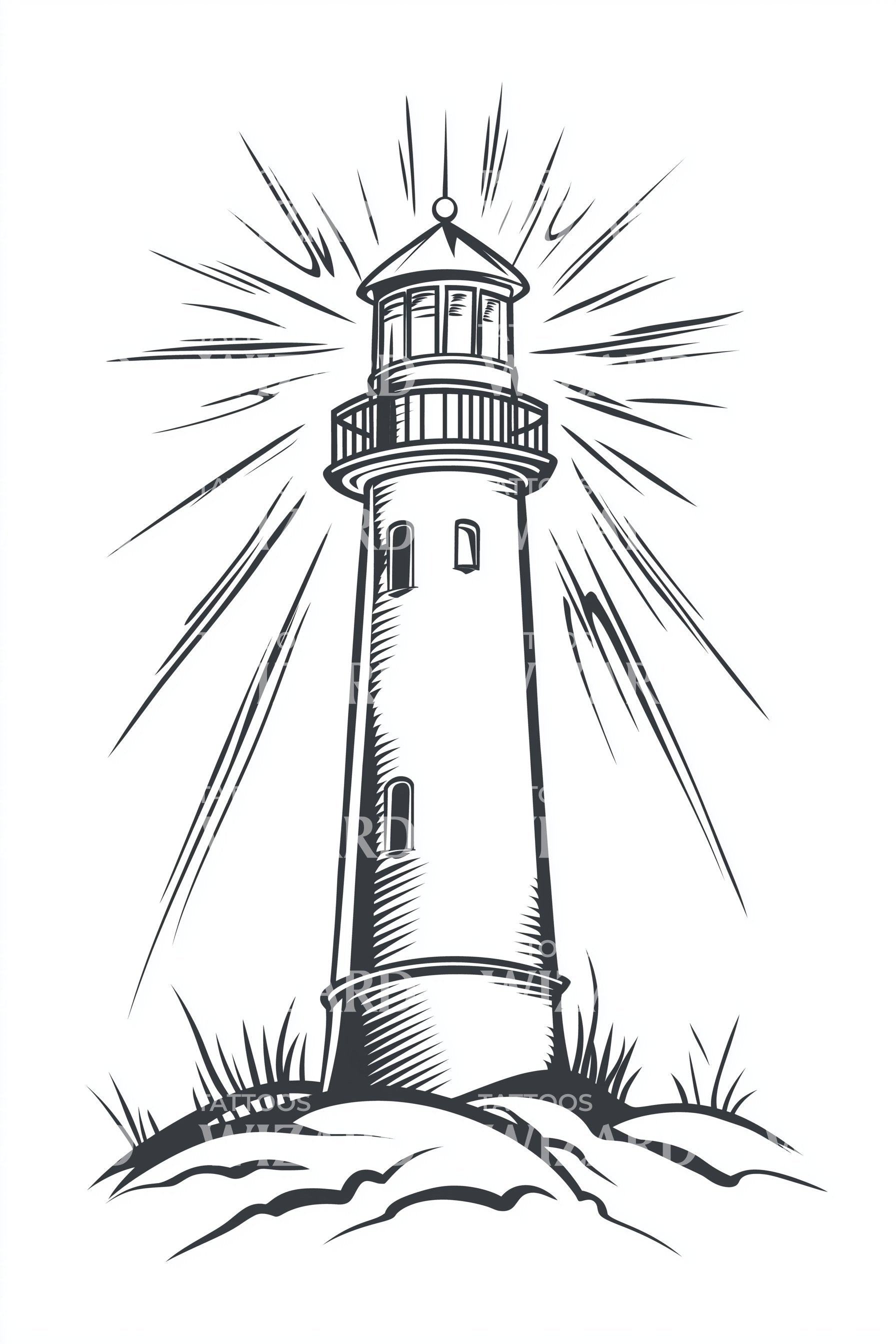 Sketch-lined lighthouse rises on a rugged coast, clean black strokes and radiant rays cutting the white like sea wind. Beacon of guidance and safe return, it keeps faith bright through storms. Wearer feels anchored yet fearless. Ideal placements: forearm, calf, spine, or ribcage; lines match the tower, rays flare.