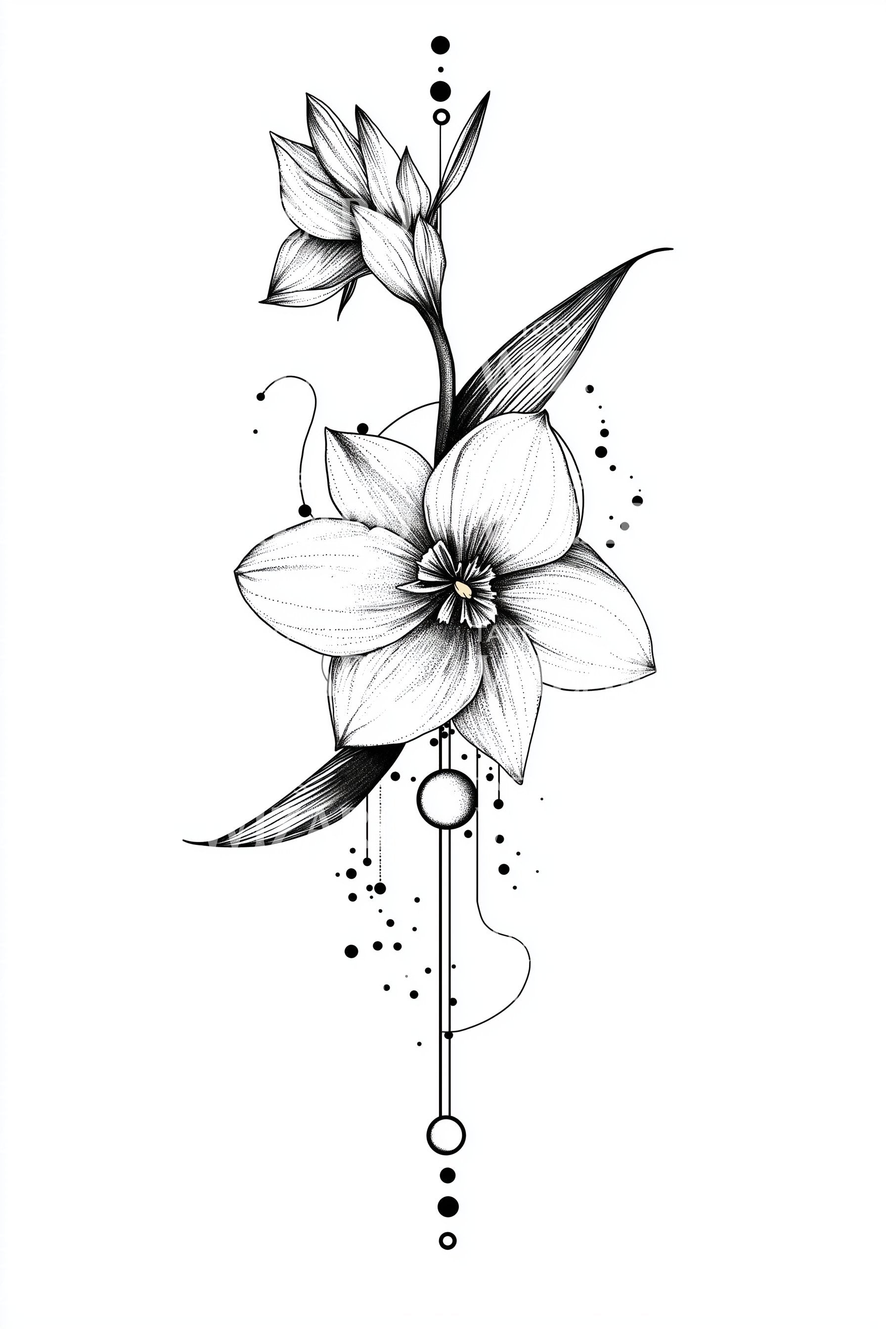 This fineline tattoo design boasts a delicate balance of linearity and blossoming beauty, rendered in exquisite dotwork. An enchanting vertical composition that dances between strength and subtlety. Ideal for lovers of intricacy and style who appreciate the elegance embedded in simplicity.