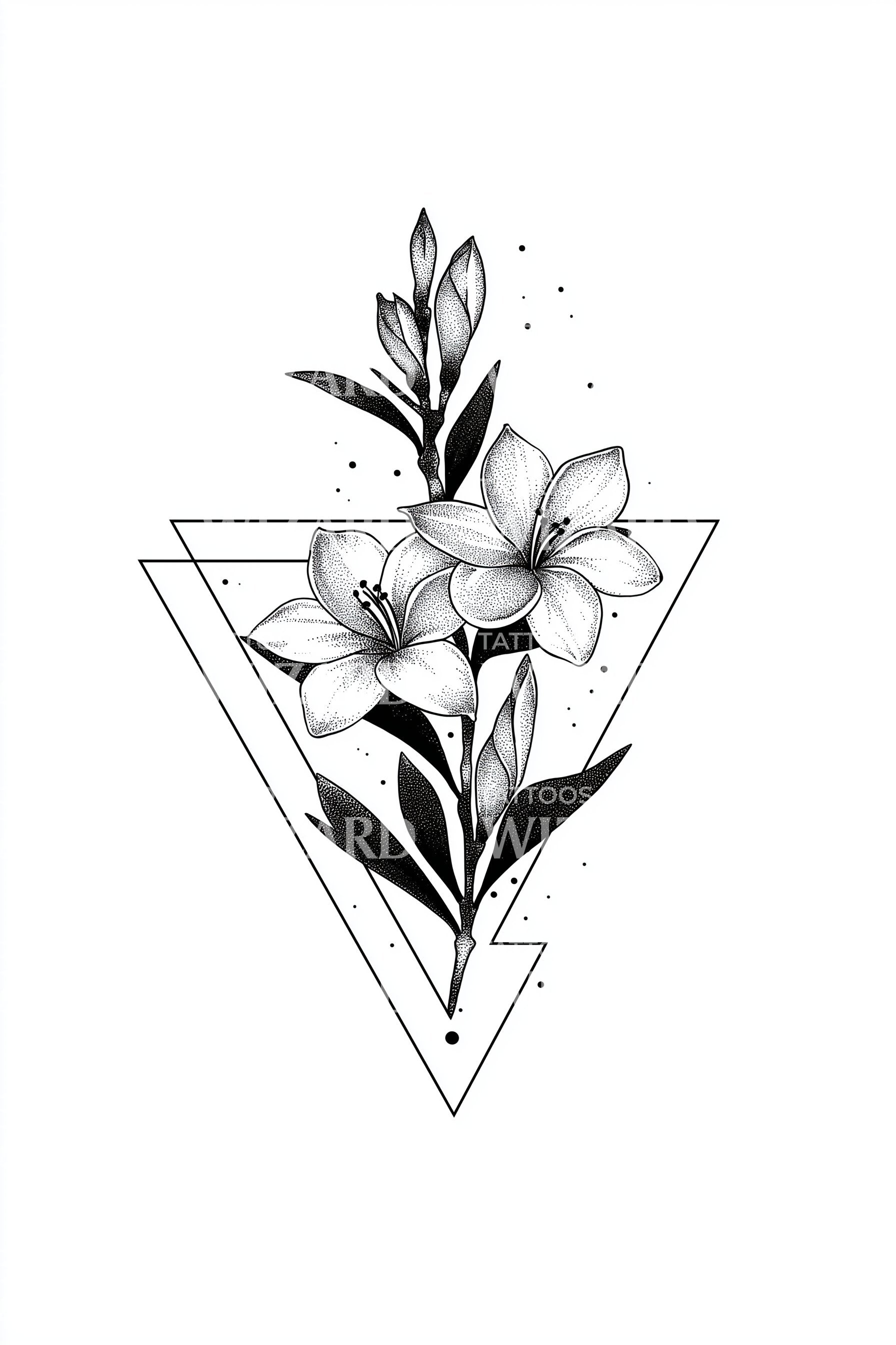 Immerse in the beauty of this sleek, jasmine-inspired tattoo design. Crafted with linear and geometric patterns, it stunningly captures the essence of the fragrant flower within a captivating triangular outline. Ideal for those who appreciate minimalistic yet symbolically profound body art.