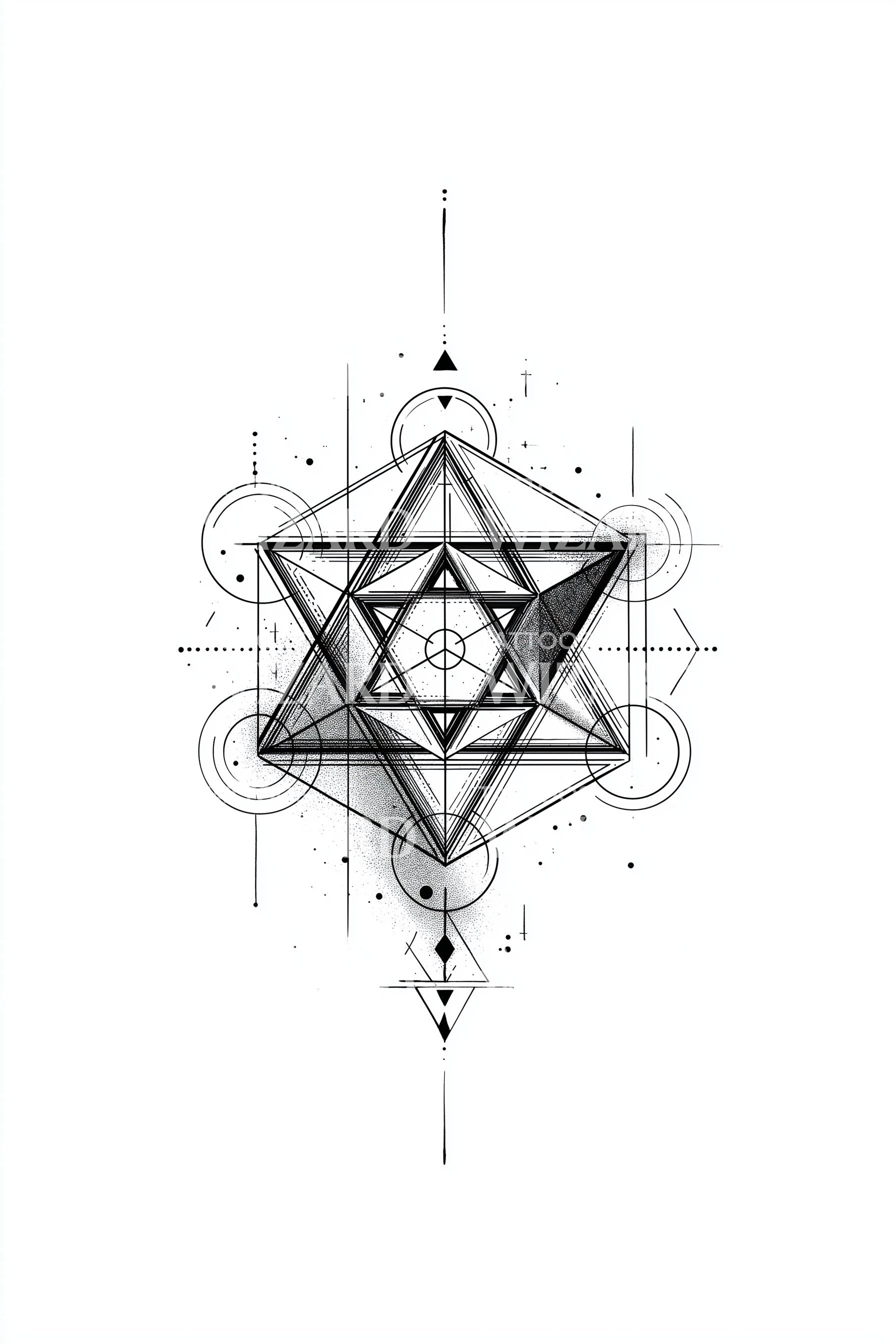 Bask in the sacred symbolism of the Geometric Merkaba Star Tattoo Design. Unique geometry converges to form a hexagonal pattern, evoking the divine energy of the merkaba. This distinguished piece marries mysticism with modernity, making it a perfect choice for those seeking harmony in the sacred and the contemporary.