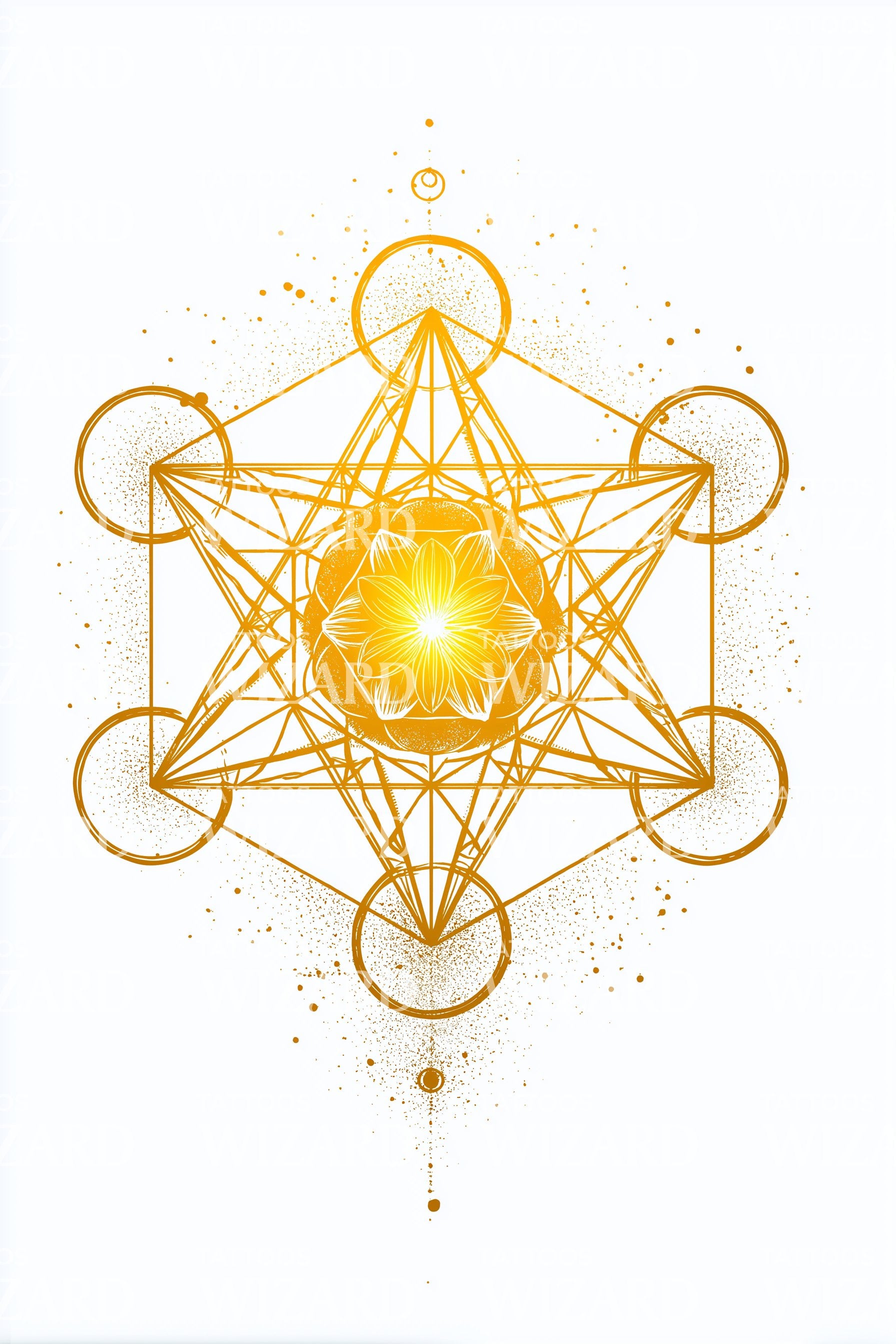 Immerse yourself in sacred geometry with this golden Metatron tattoo design. Adorned with an orb of light, it radiates with celestial energy - an homage to divine intelligence and order. This tattoo illuminates the beauty of geometry, revealing a harmonious blend of aesthetics and spirituality.