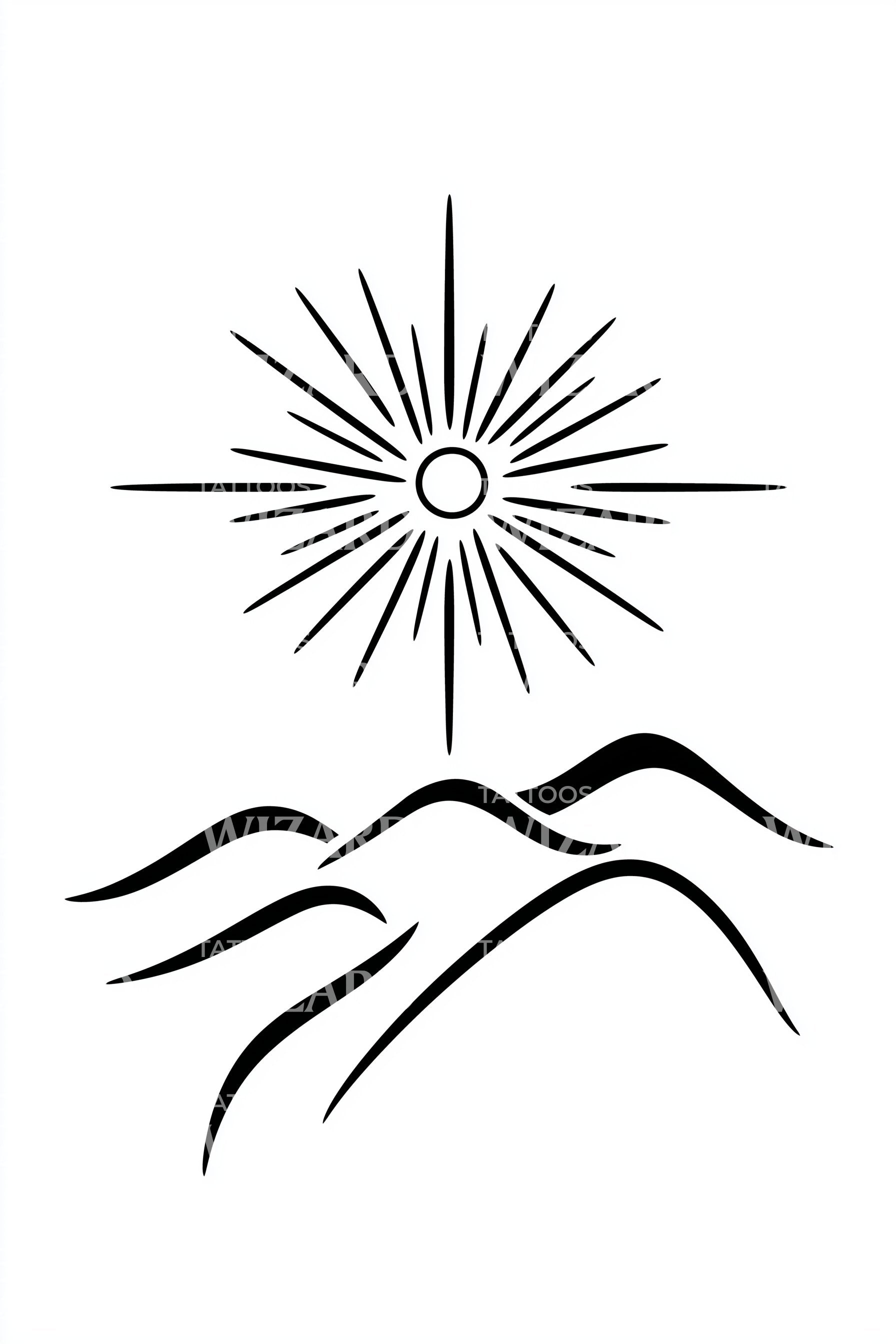 Minimalist linework forms rolling mountains beneath a radiant sunburst. Clean arcs suggest quiet horizons, while the centered sun marks clarity and renewal. Mountains speak of endurance and steady ascent. Worn daily, the design gives calm focus, warm optimism, and a reminder to breathe toward brighter summits each day.