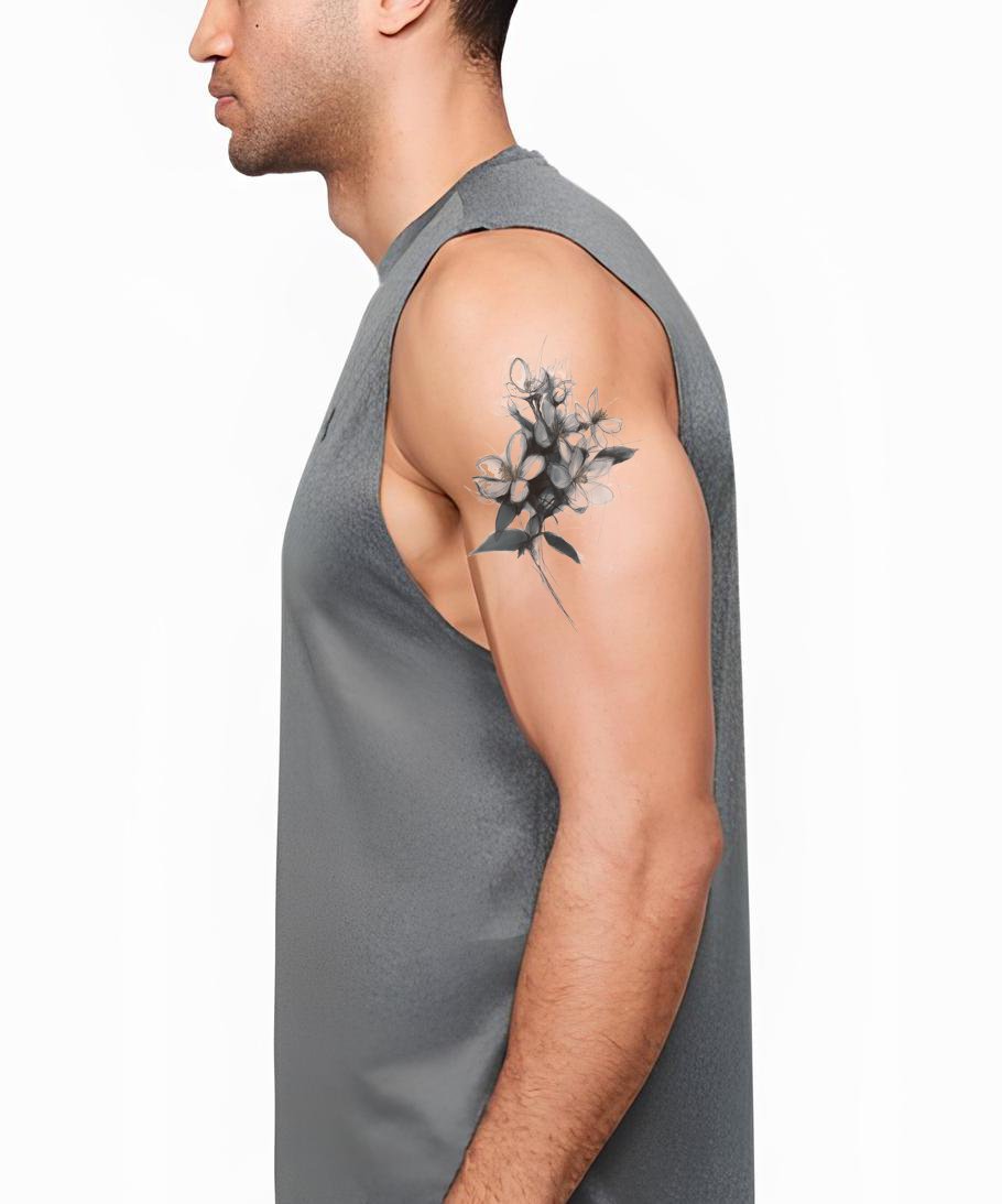 Discover minimalistic elegance with this fineline tattoo design. This monochrome masterpiece borrows inspiration from nature featuring an intricately drawn blossom branch. Exuding a floral charm, its distinct simplicity makes it an exquisite choice for lovers of minimal and elegant body art.