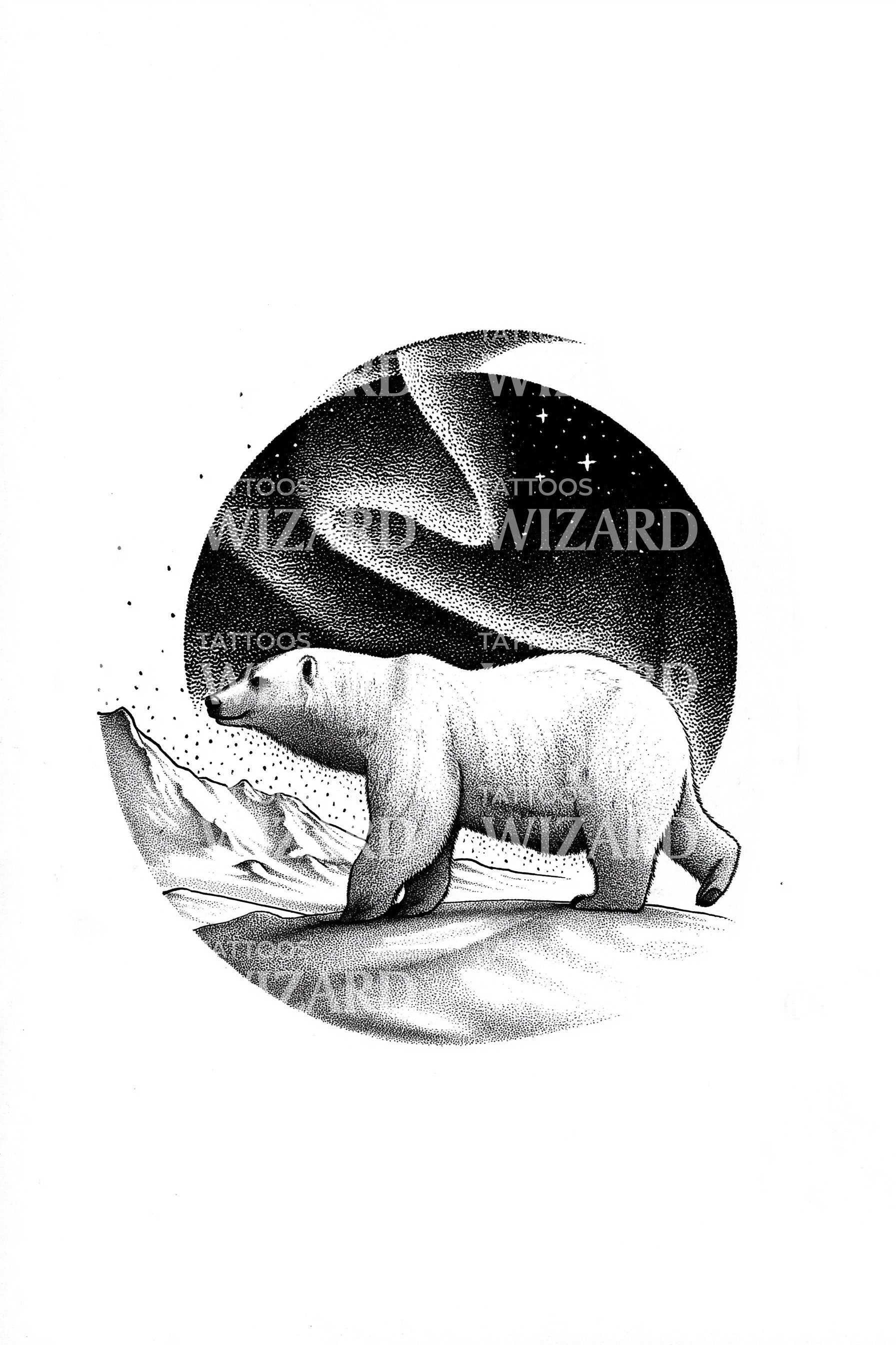 Microrealism in soft stippled tones forms a circular, moonlit landscape: a polar bear padding across winter ice beneath swirling aurora and cold stars. The bear embodies resilience and solitary guidance, the sky a compass of hope. Wearing it feels calm yet courageous, steady as northern light.