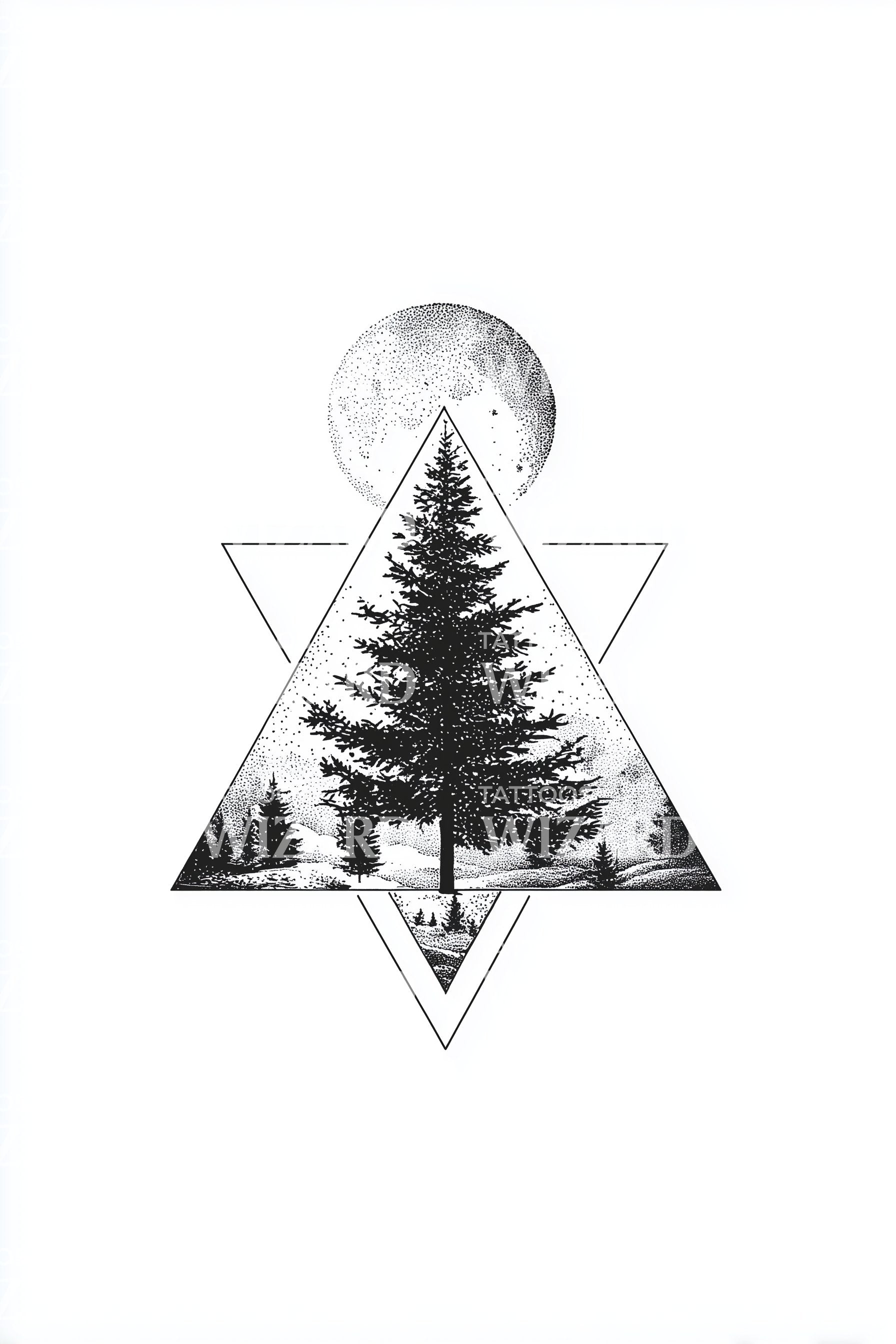 Geometric serenity frames a towering pine within interlocking triangles, dotwork moon rising over quiet mountains. The triangle honors balance and direction, the moon whispers cycles, the tree anchors resilience. Minimal lines invite spacious breath, giving the wearer calm courage, steady purpose, and a compass toward wild, intentional living.