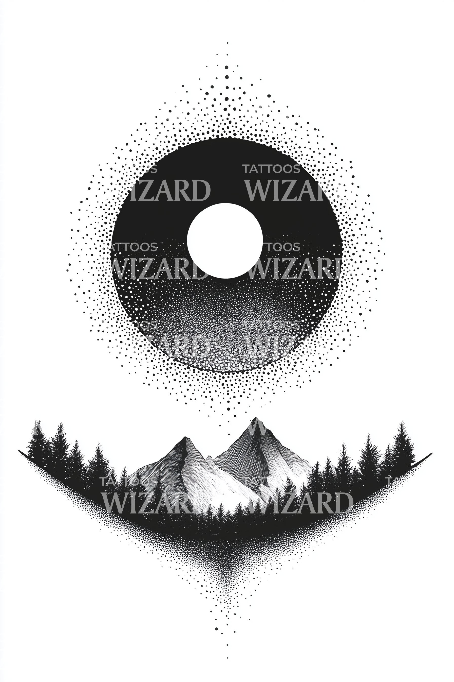 Immerse yourself in the serenity of nature with this dotwork tattoo design. Featuring a beautifully intricate ring of mountains, this piece captures the majesty of a landscape in splendid detail. A perfect blend of visual aesthetics for those who carry their love for nature on their skin.