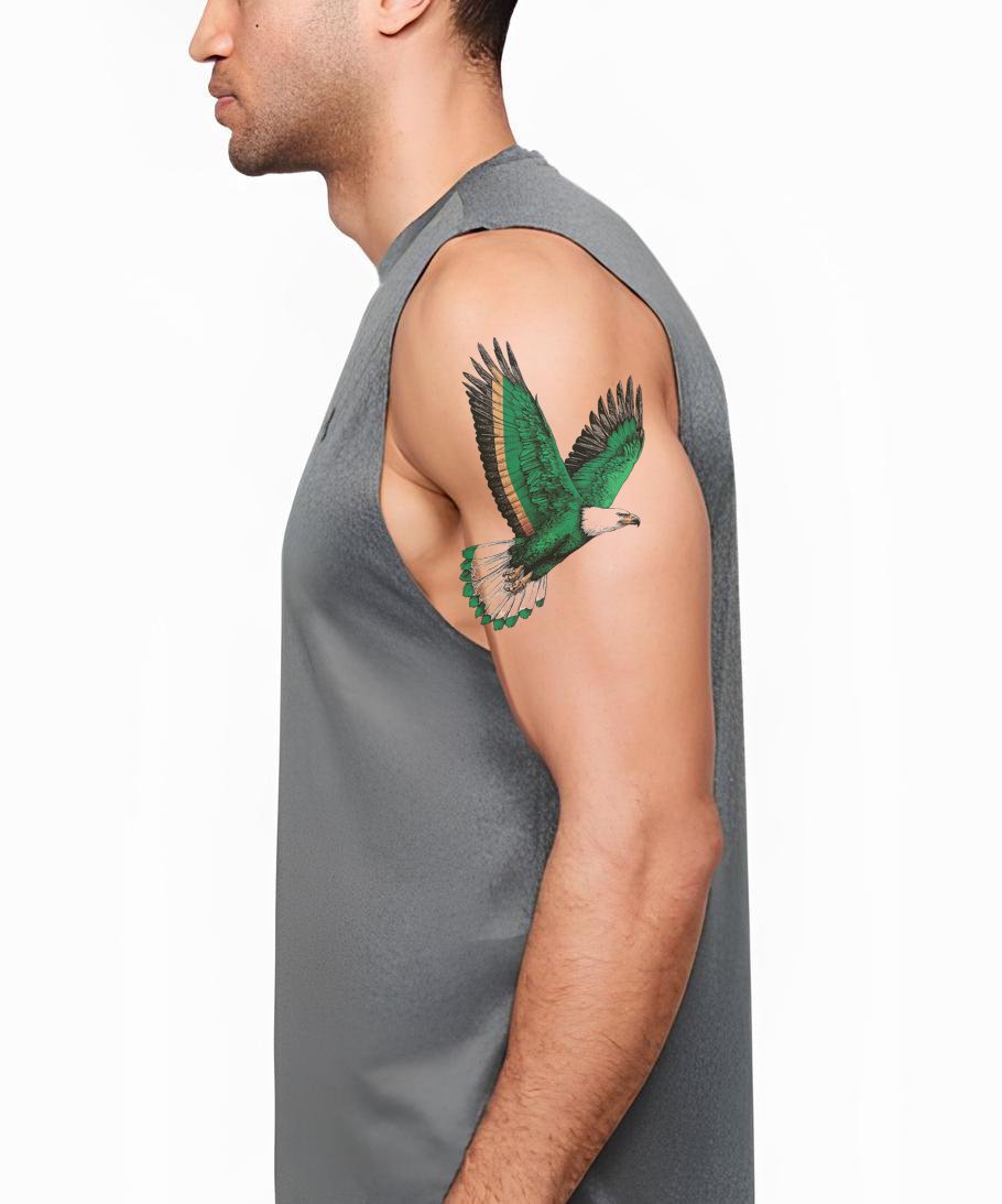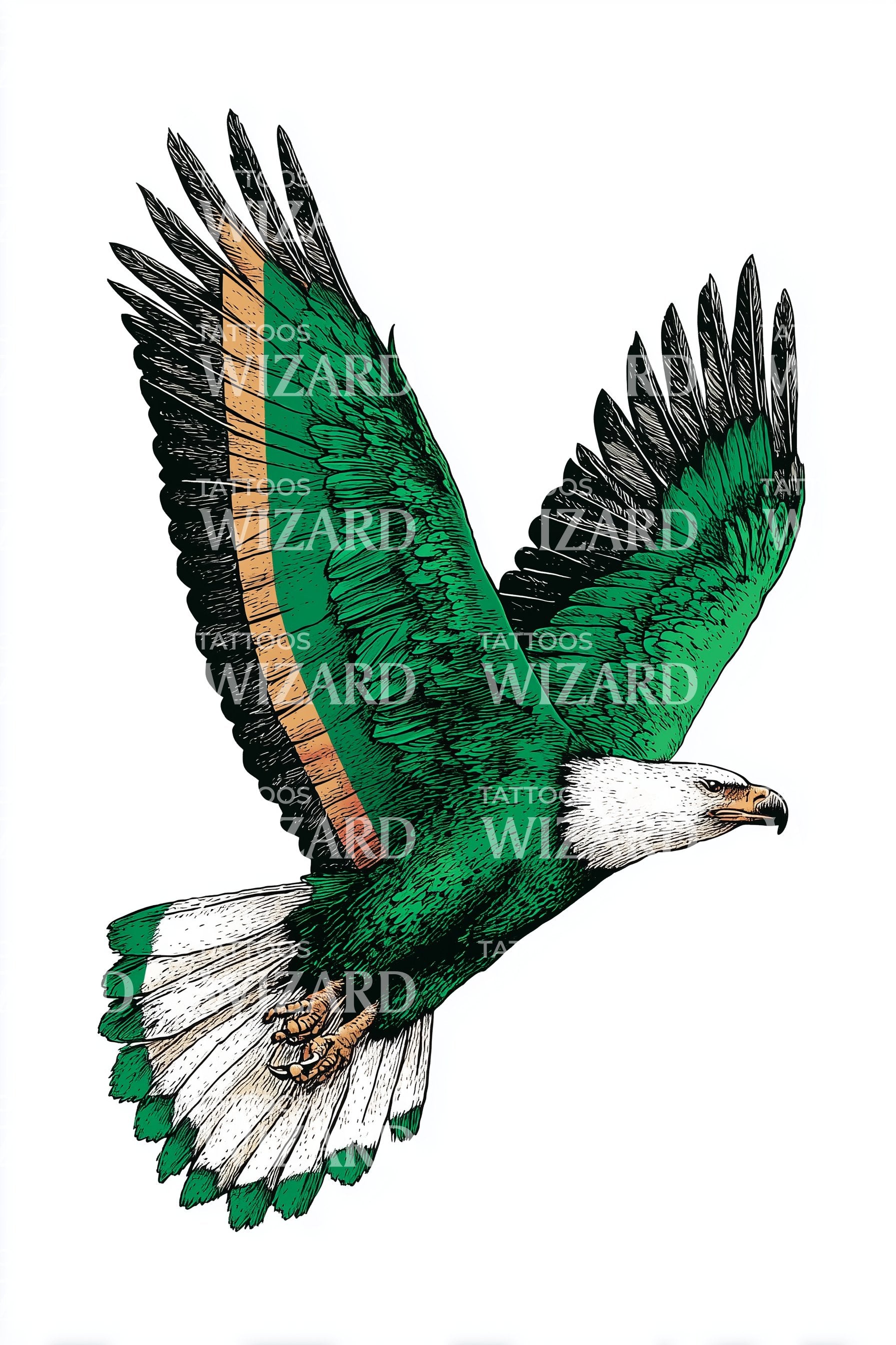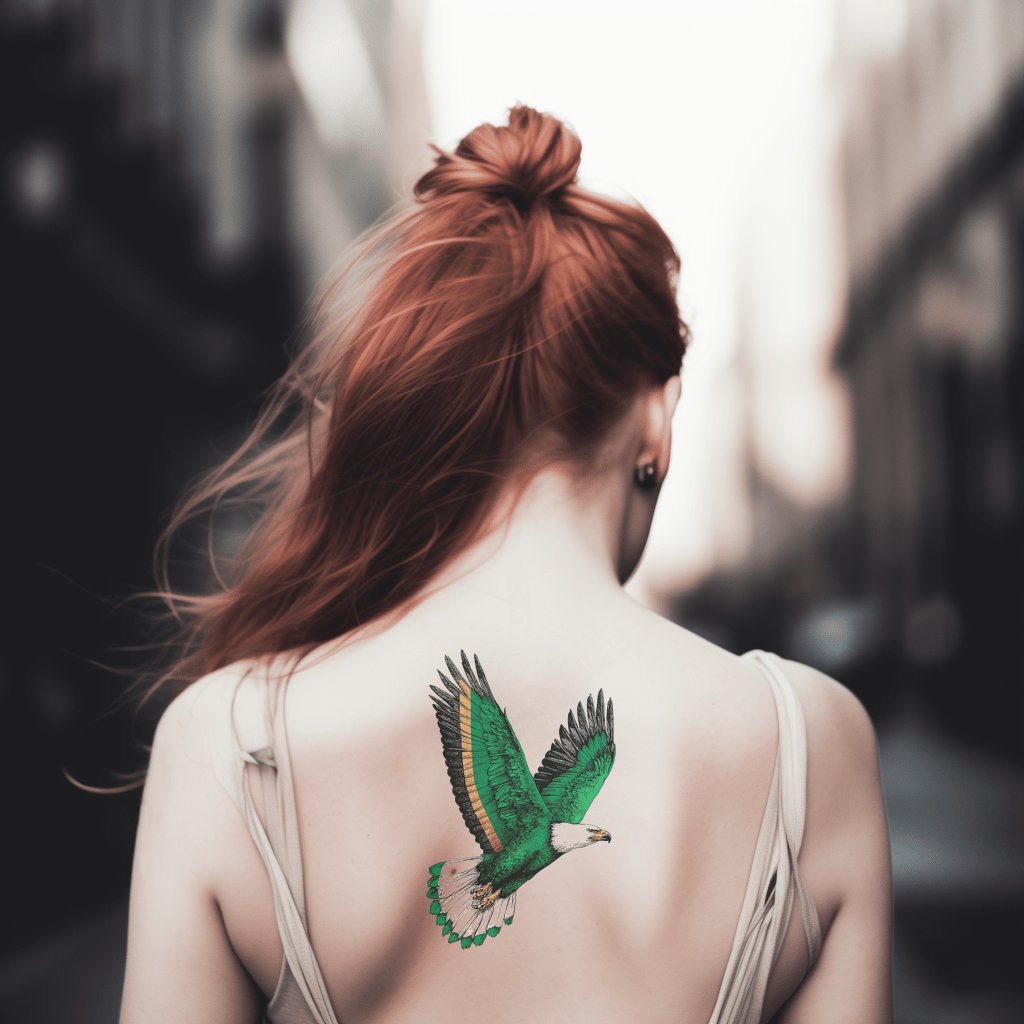 This watercolor tattoo captures a soaring eagle in vibrant green hues, honoring Nigeria’s spirit. Fluid brushstrokes suggest boundless freedom, while subtle white accents echo the flag. Dynamic splashes and airy gradients create motion and grace—perfect for expressing cultural pride, resilience, and a fierce, uplifted heart. Strength, vision, possibility.