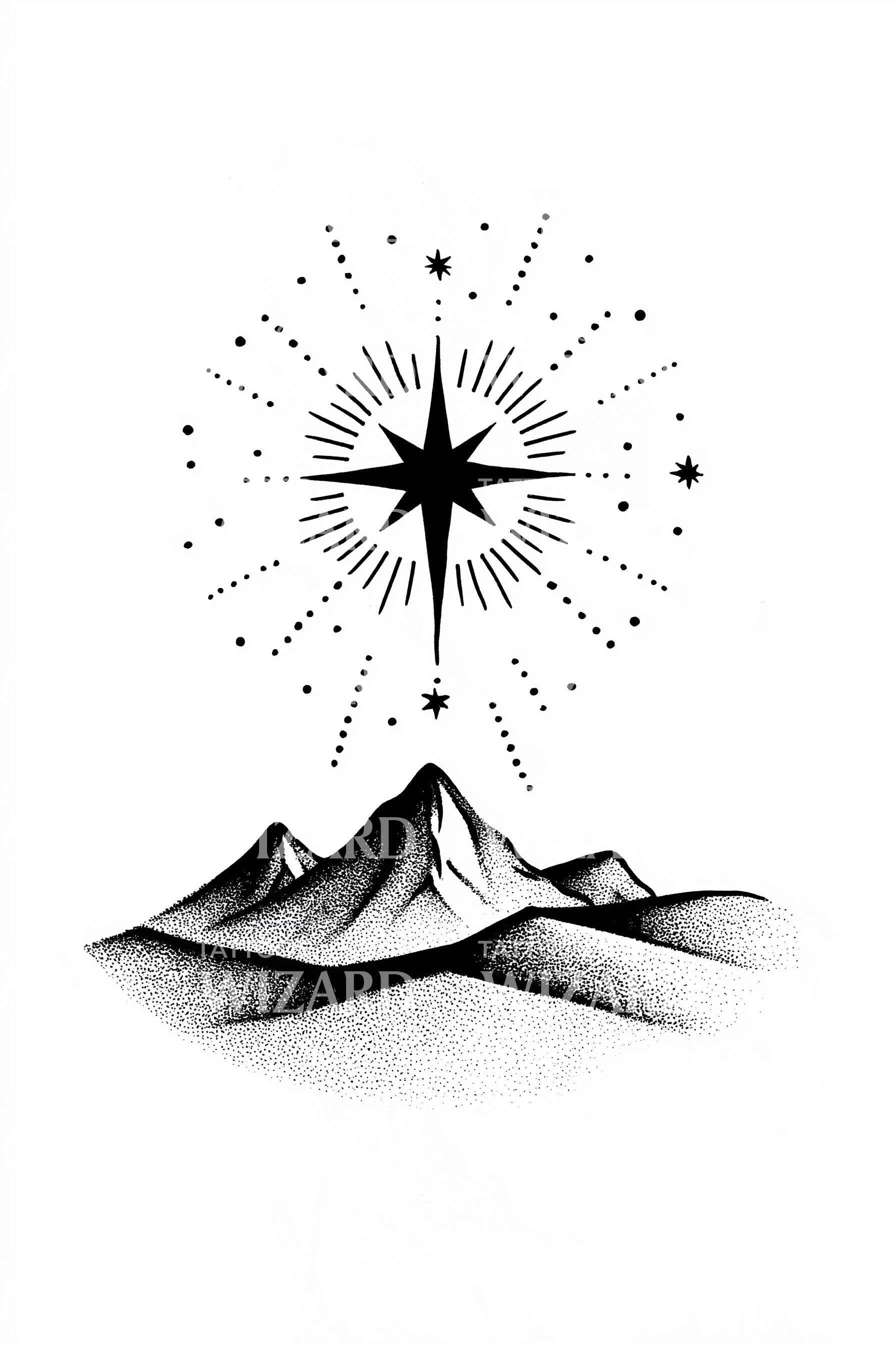 Radiant dotwork star crowns sleeping mountains, its rays and drifting points lighting a quiet night. Stippled slopes rise with patient strength, while the Christmas-like guiding star symbolizes direction, faith, and renewal. Worn on skin, this scene whispers courage, mountain-born resilience, and a promise to keep moving toward light.