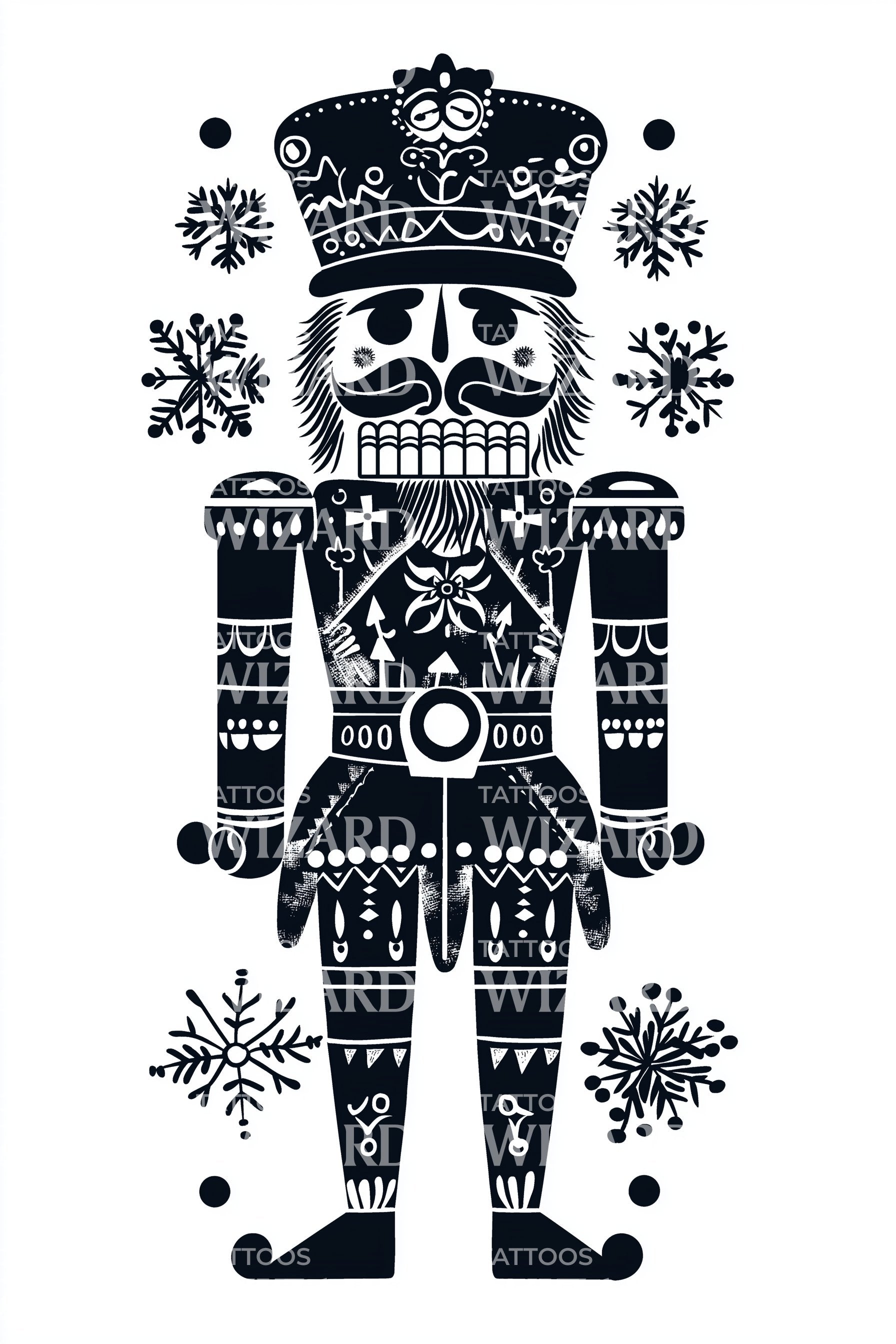 Neotraditional nutcracker stands in bold blackwork, ornate crown, carved mustache, and toy-soldier regalia framed by crisp snowflakes. This winter guardian symbolizes steadfast courage, childhood wonder, and Christmas protection. Wearing it feels like carrying hearthlight through frost, a reminder to defend joy, traditions, and the heart’s quiet magic.