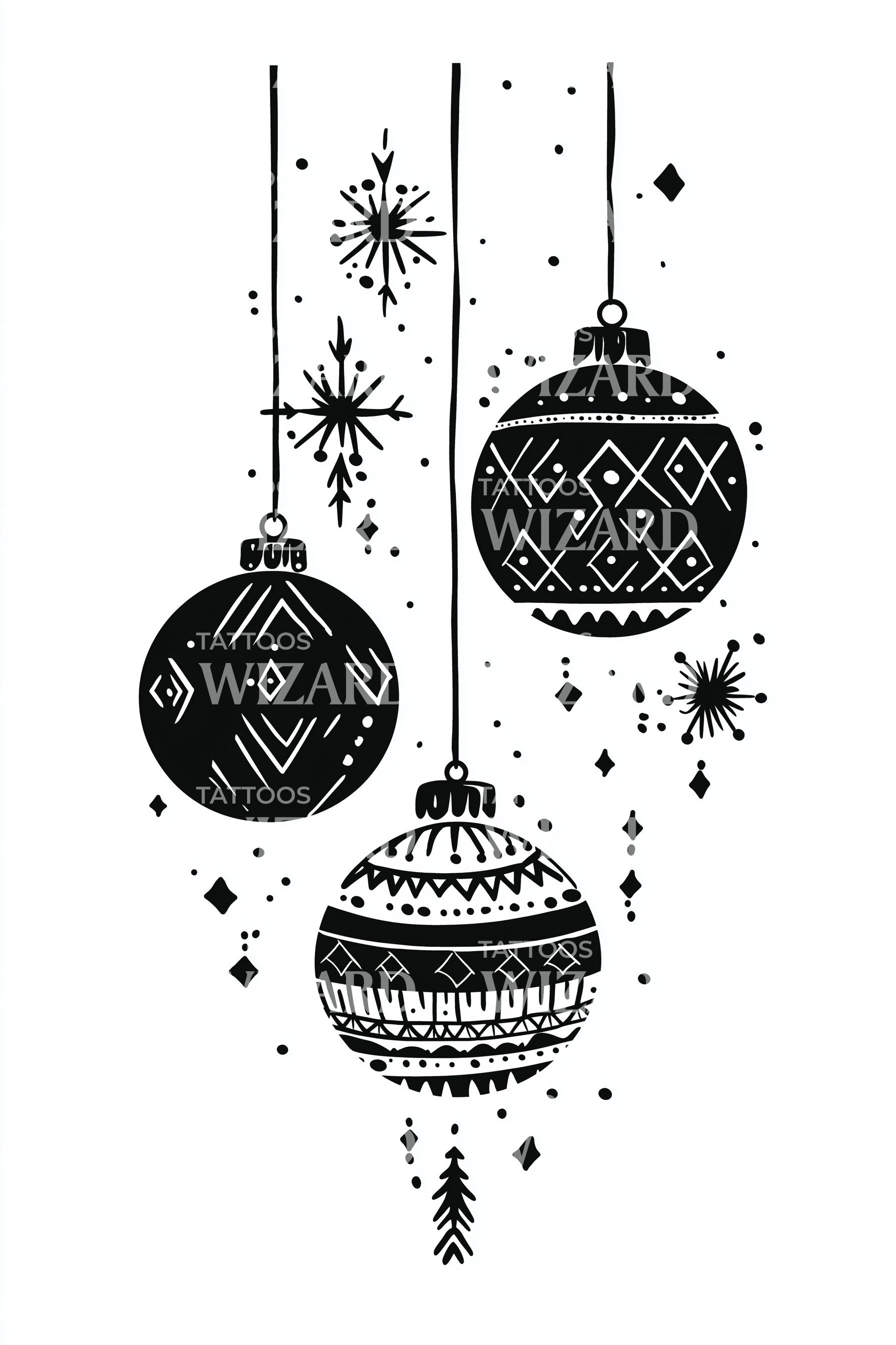 Nordic baubles sway in dotwork grace, suspended by fine lines amid glittering stars and drifting specks. Geometric patterns echo Christmas folklore, talismans of warmth, memory, and light carried through the dark season. Wearing this design feels like cozy hush and hearthfire sparkle, a keepsake of gatherings and hope.