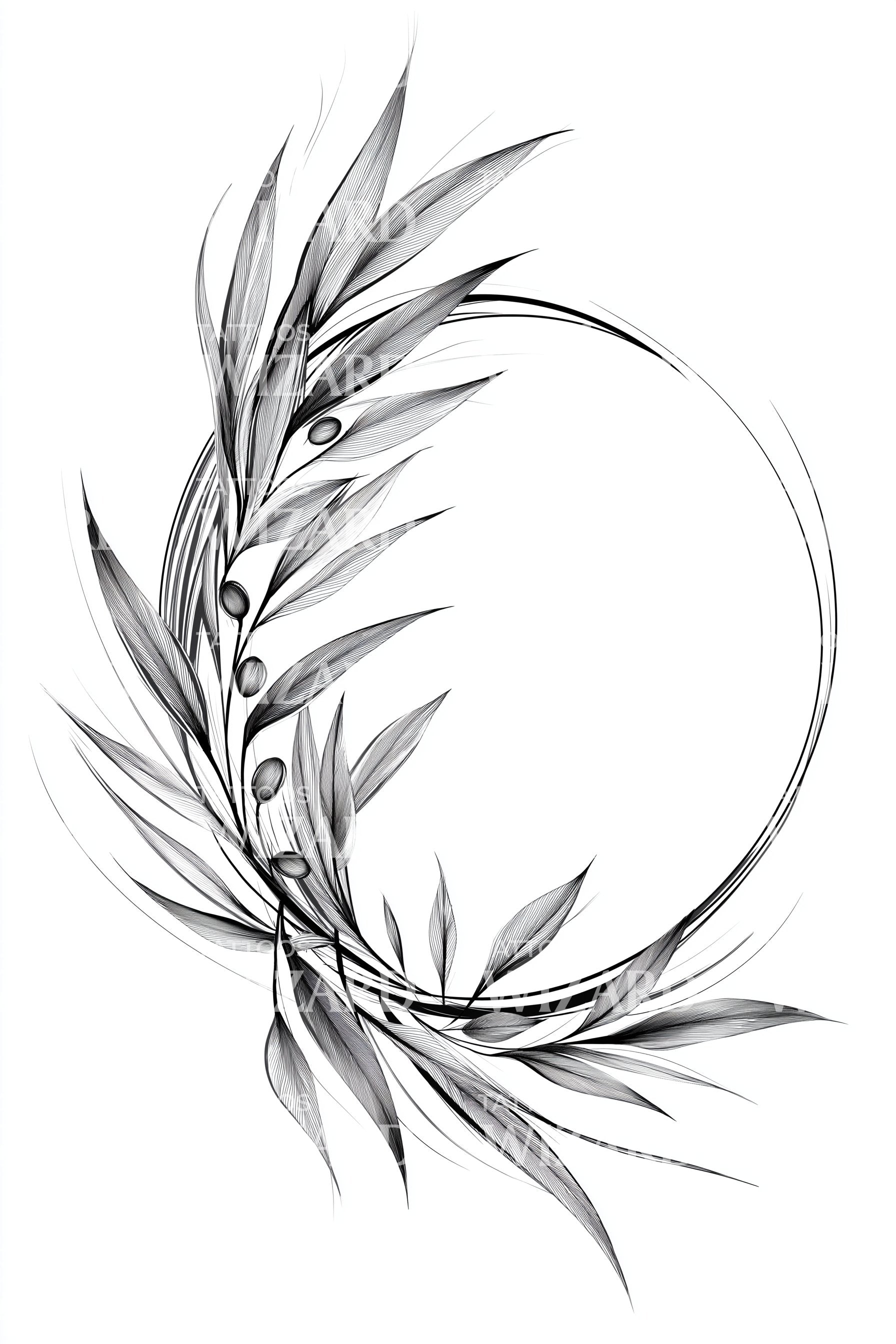 Graceful fineline laurels arc into a near-circle, their botanical leaves and ripening olives rendered in airy shading and crisp linework. A wreath of calm and quiet triumph, symbolizing peace, resilience, and renewal. Worn close, the design feels like a soft crown, centering breath and intention, daily clarity rising.