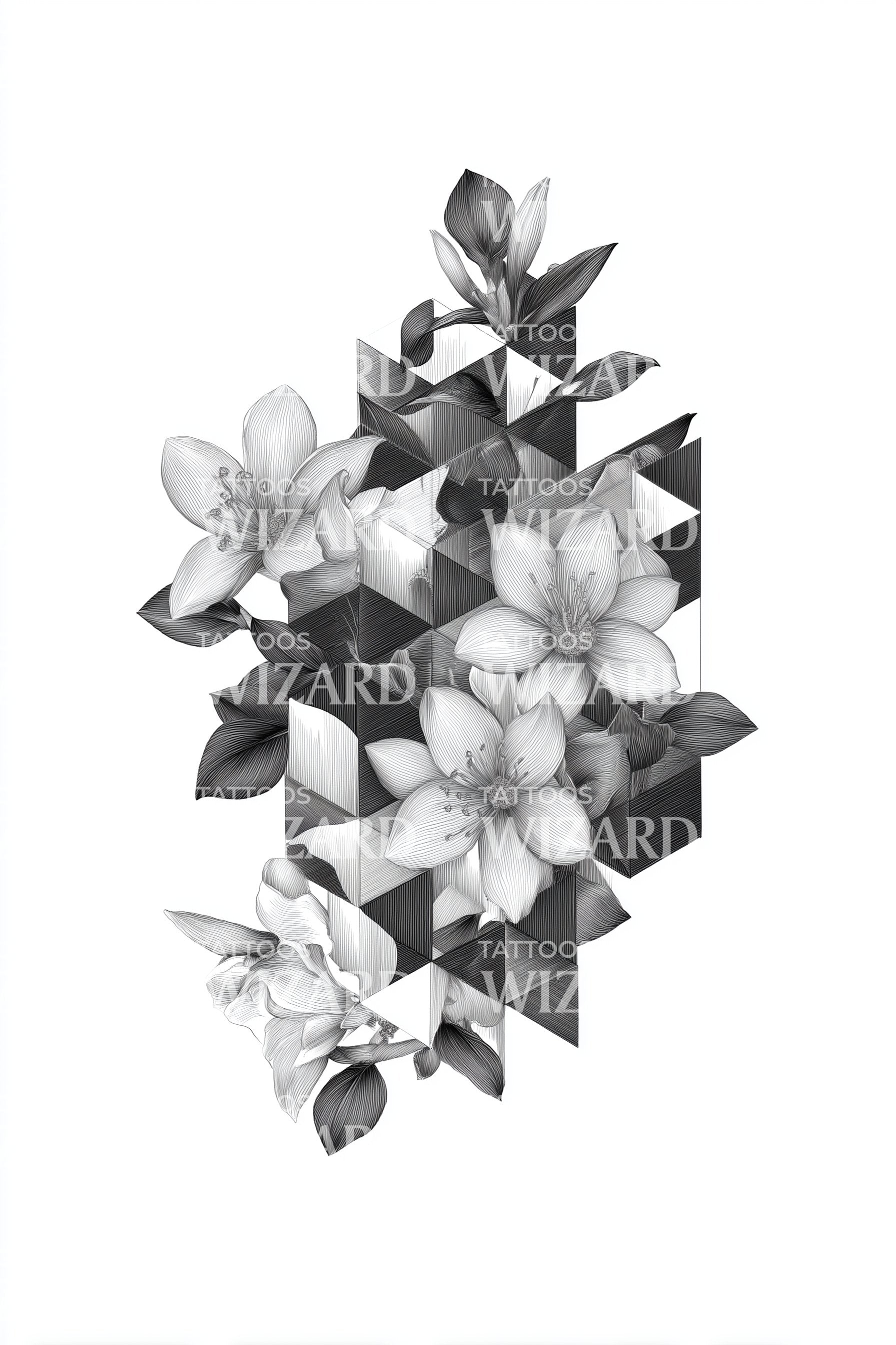 Adorn your skin with this geometric orchid tattoo design. The abstract prism pattern fused with monochrome floral detailing illustrates a striking play of symmetry and artistic ingenuity. It's a unique way to embrace botanical aesthetics, offering a visual treat to every tattoo enthusiast.