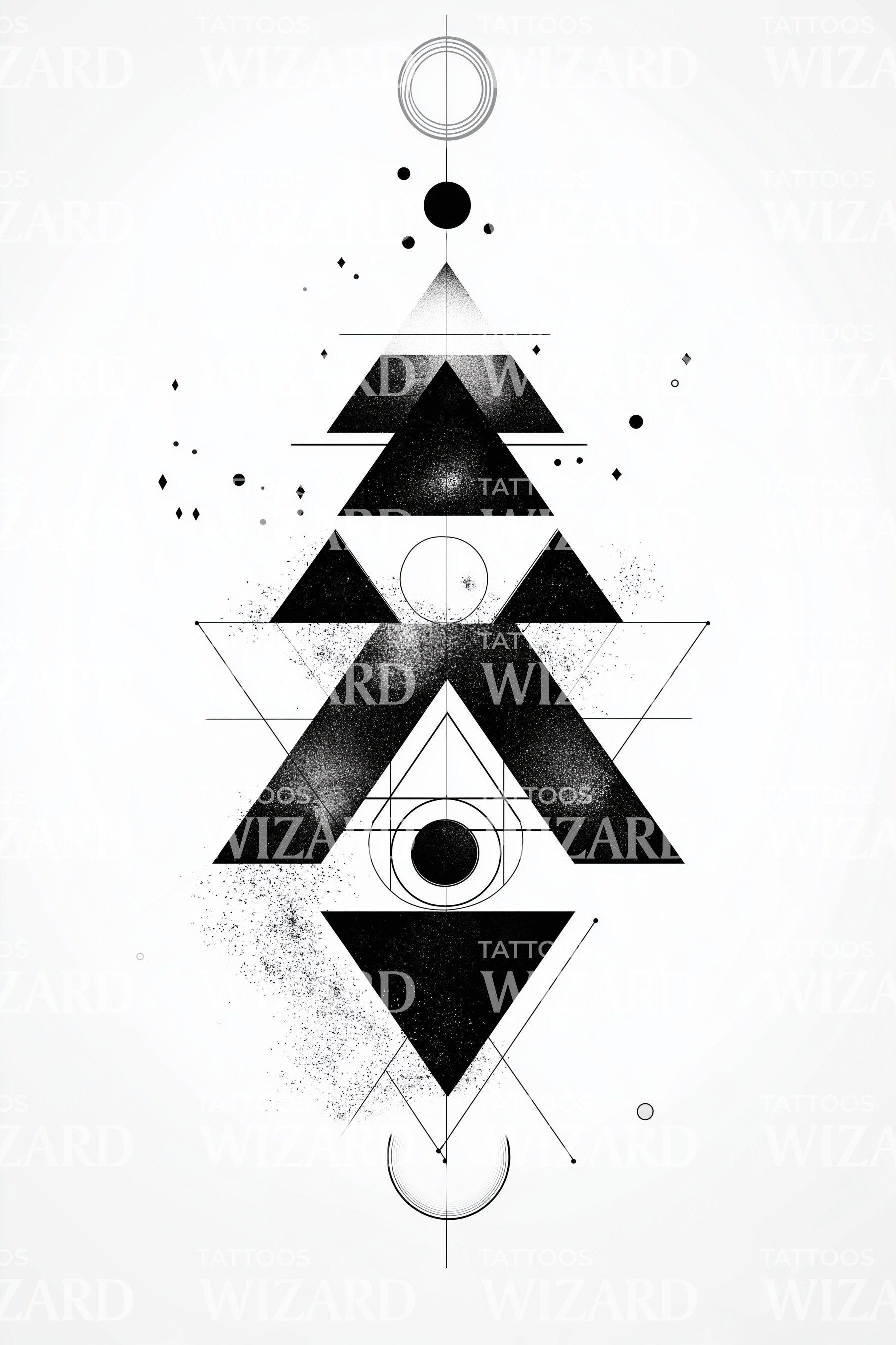 Architected triangles and crisp circles rise like a modern tree, speckled shadows and fine lines shaping hanging ornaments of intention. Geometry maps growth, balance, and celestial cycles, a minimalist tree of life. Wearing it feels grounded, clear, quietly powerful, inviting steady ascent and rooted calm, everyday resilience within.