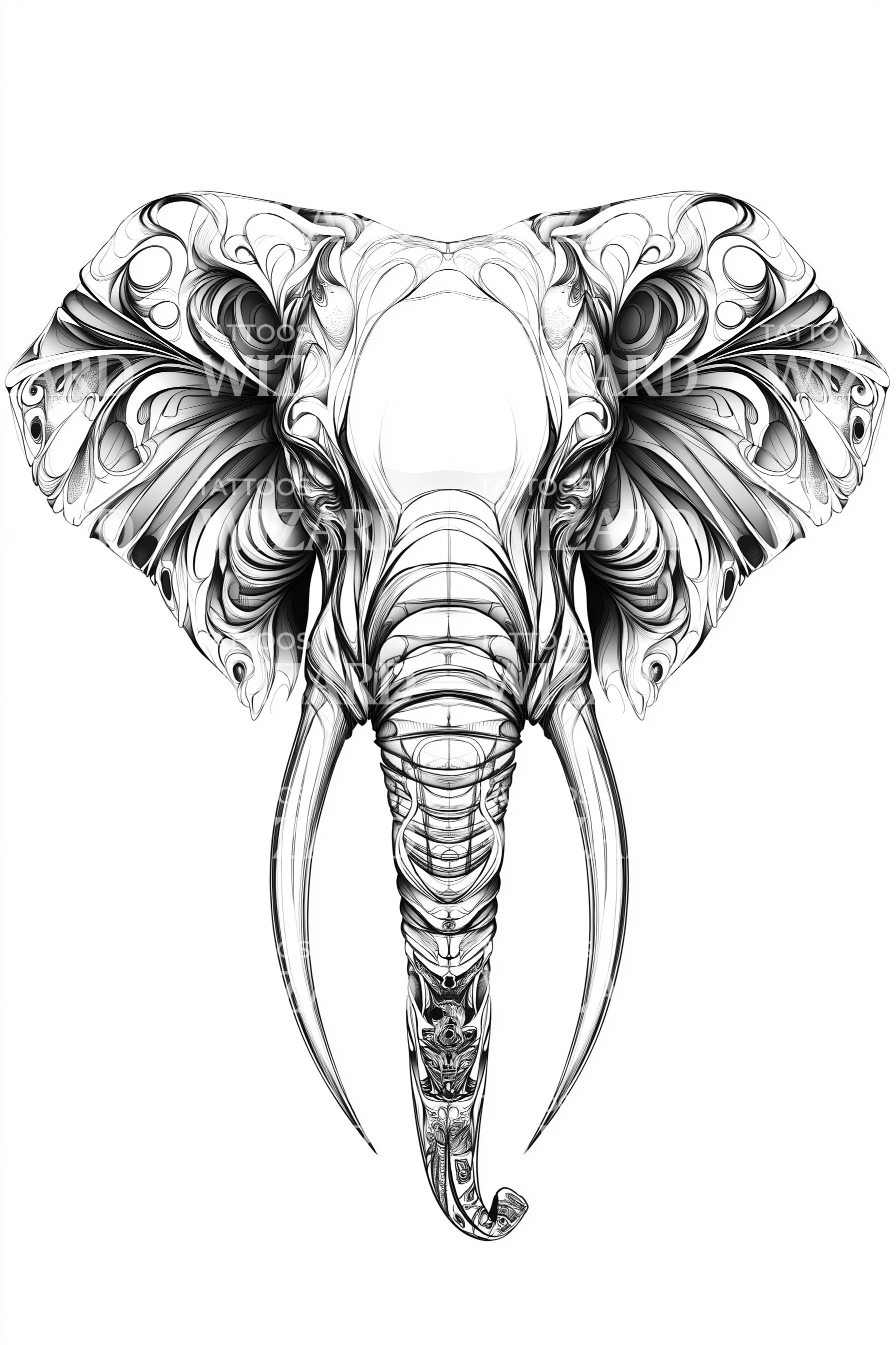 Regal elephant visage blooms from ornate linework, ears unfurling like mandala wings and a lithe trunk framed by brave tusks. Patterns channel wisdom, memory, and grounded strength, guiding the spirit through quiet power. Wearing it feels steady, protected, mindful, and royally connected to ancient earth and timeless courage.