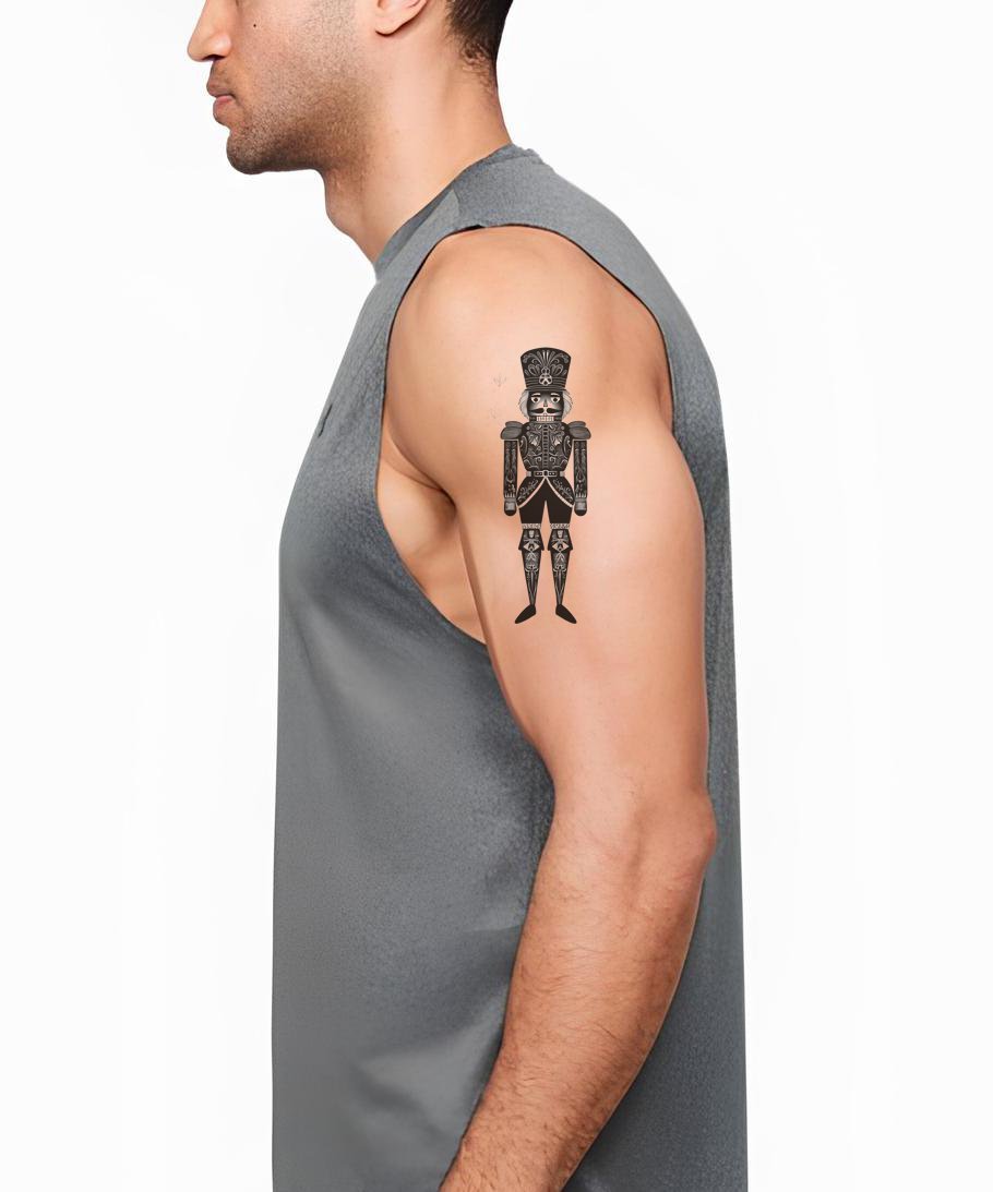 Blackwork nutcracker stands as an ornate folk soldier, carved in bold graphic lines and snowflake constellations. Patterned armor speaks of winter guardianship, resilience, and childhood wonder. Symbolic jaws protect the heart, cracking fears into stars. Wearing it invites steadfast courage, nostalgic magic, and disciplined grace with festive edge.